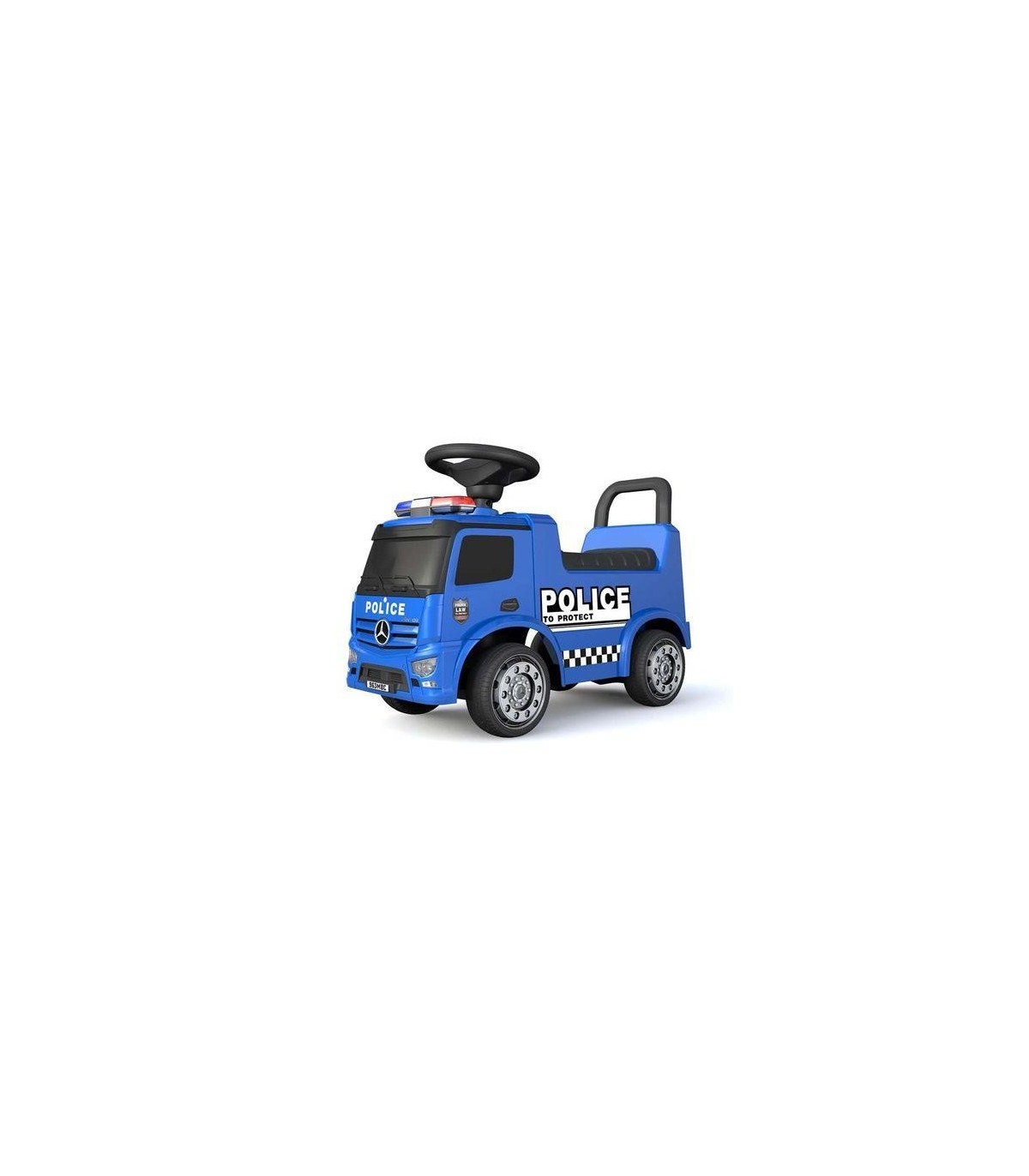 Correpasillos Mercedes azul, camión de policía de gran calidad, pensado para ayudarle en sus primeros pasos y mantener equilibrio y motricidad Con sonidos y música. Cajón debajo del asiento para guardar cosas. Neumáticos de goma. Sistema anticaída. Hasta 25 kg.