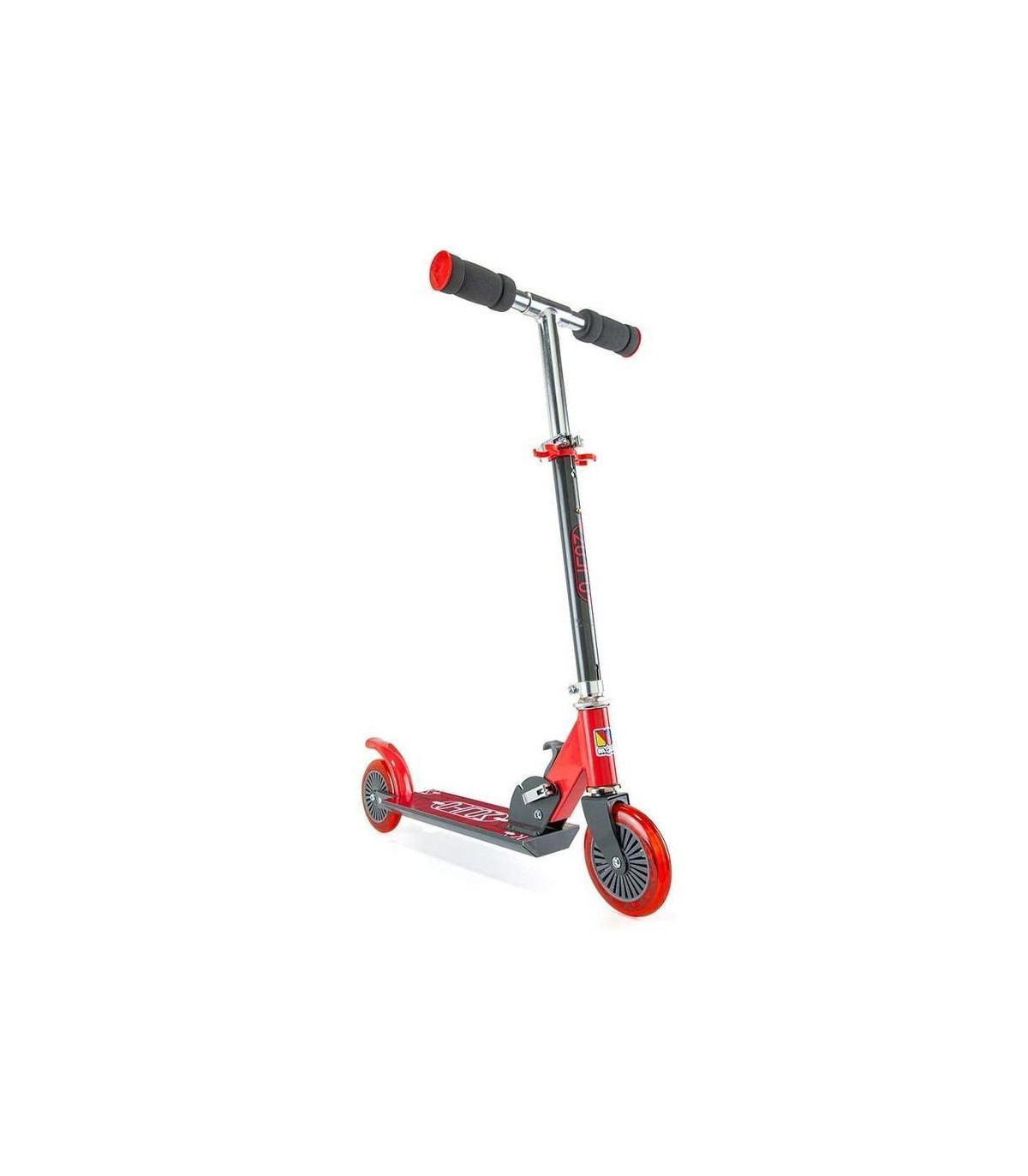 Patinete de color rojo para niños y niñas, fabricado en aluminio, plegable y con cierre de seguridad. Con plataforma antideslizante, ruedas de poliuretano de 120 mm, sistema ABEC 5, peso máximo del usuario: 50 kgs y manillar regulable en altura con dos posiciones 72 - 77 cms suave y acolchado con un gran agarre que garantiza comodidad y control. Sistema de frenado por fricción trasera y un pie de apoyo. Para peques a partir de 3 años. No recomendable para menores de 3 años, ya que contiene piezas pequeñas que podrían provocar asfixia en caso de ser ingeridas por el niño/a.