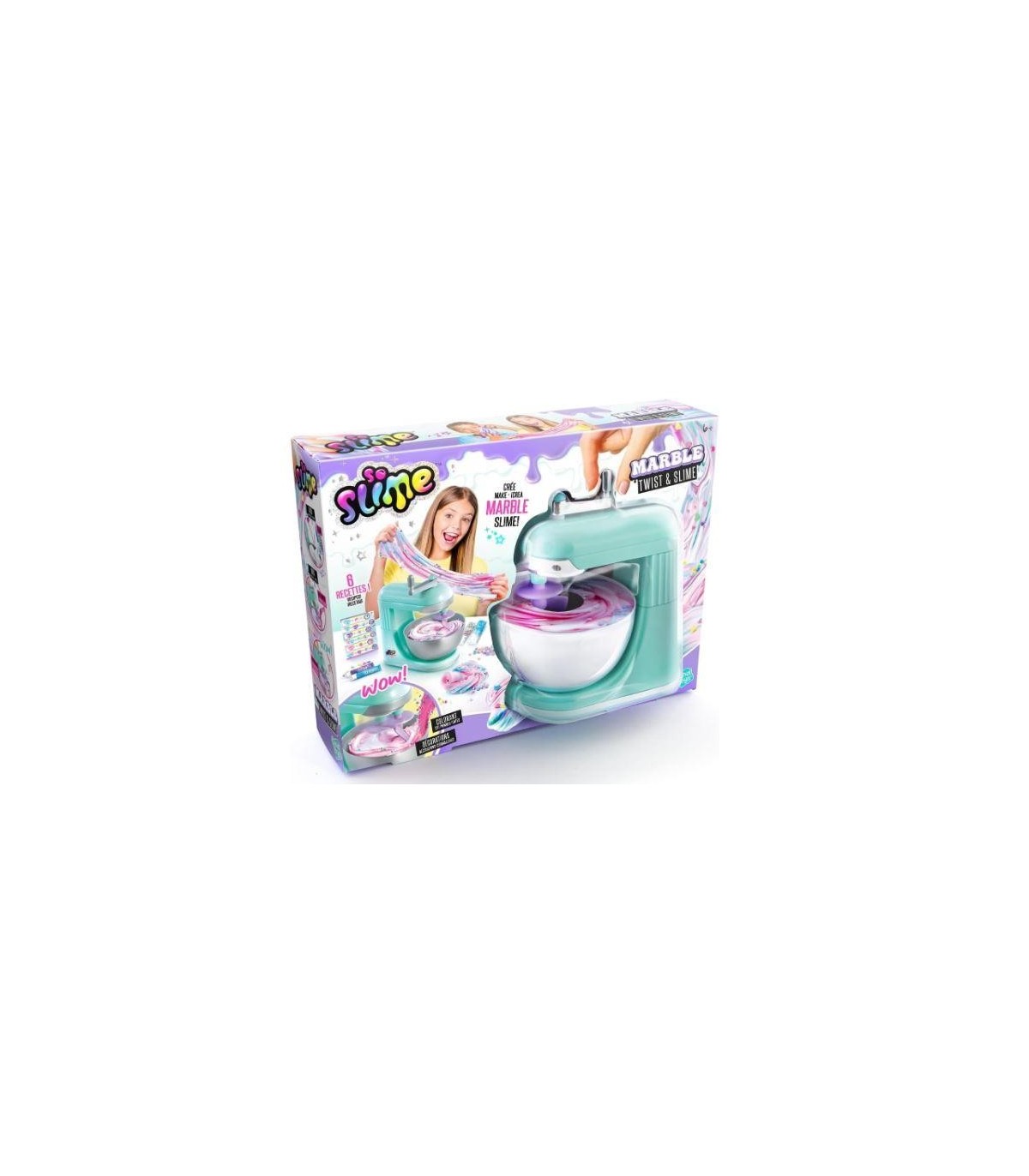 Un mezclador de Slime para mezclar tu slimes como un auténtico profesional. Incluye una guía de recetas para que puedas crear slimes realmente únicos. Pon tu slime blanco en el mezclador, añade colorante y decoraciones y observa cómo se mezcla.
