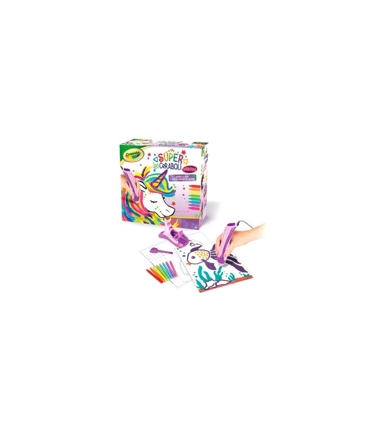 El Súper Ceraboli es muy fácil de utilizar, solo tienes que introducir tus ceras Crayola sin el envoltorio, enchufar el aparato y esperar a que la luz se ponga verde para empezar a crear tus dibujos La cera derretida te permite escribir, colorear, decorar y dibujar en todo tipo de superficies (cartón, vidrio, madera, cerámica, lienzo…) con un acabado único en relieve El Súper Ceraboli es completamente seguro para niños a partir de 8 años, ya que su punta no se calienta para evitar quemaduras y la cera se seca en seguida al entrar en contacto con la superficie Incluye 1 Súper Ceraboli con base y adaptador, 8 ceras Crayola, 1 herramienta multiusos, 3 láminas para practicar e instrucciones. Peligro de asfixia: contiene piezas pequeñas.