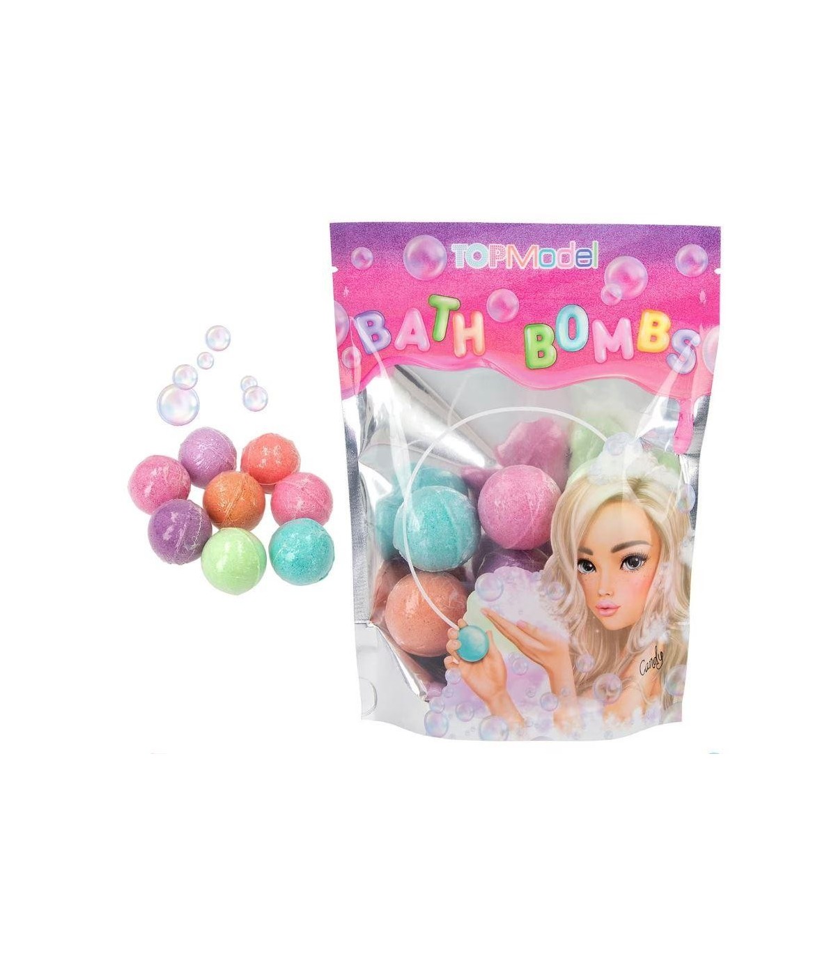 ¡Para pasárselo en grande durante el baño con TOPModel! Las 8 bombas de baño son efervescentes y se disuelven en la bañera desprendiendo un aroma maravilloso. Las bombas rosa huelen a fresa, las lila huelen a piña, las azules y las verdes huelen a chile y las de color melocotón huelen a vainilla. No aptas para niños menores de 3 años.