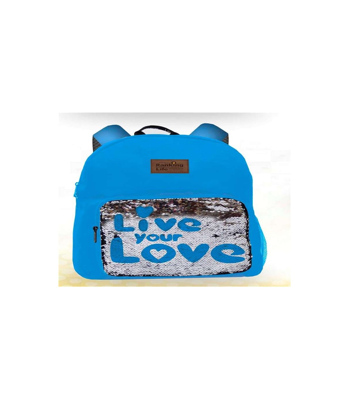 Mochila Ranking Life Azul medidas 33 x 42 x 14 cm. Con Bolsillo con lentejuelas reversibles y mensaje secreto al deslizar la mano sobre las lentejuelas
