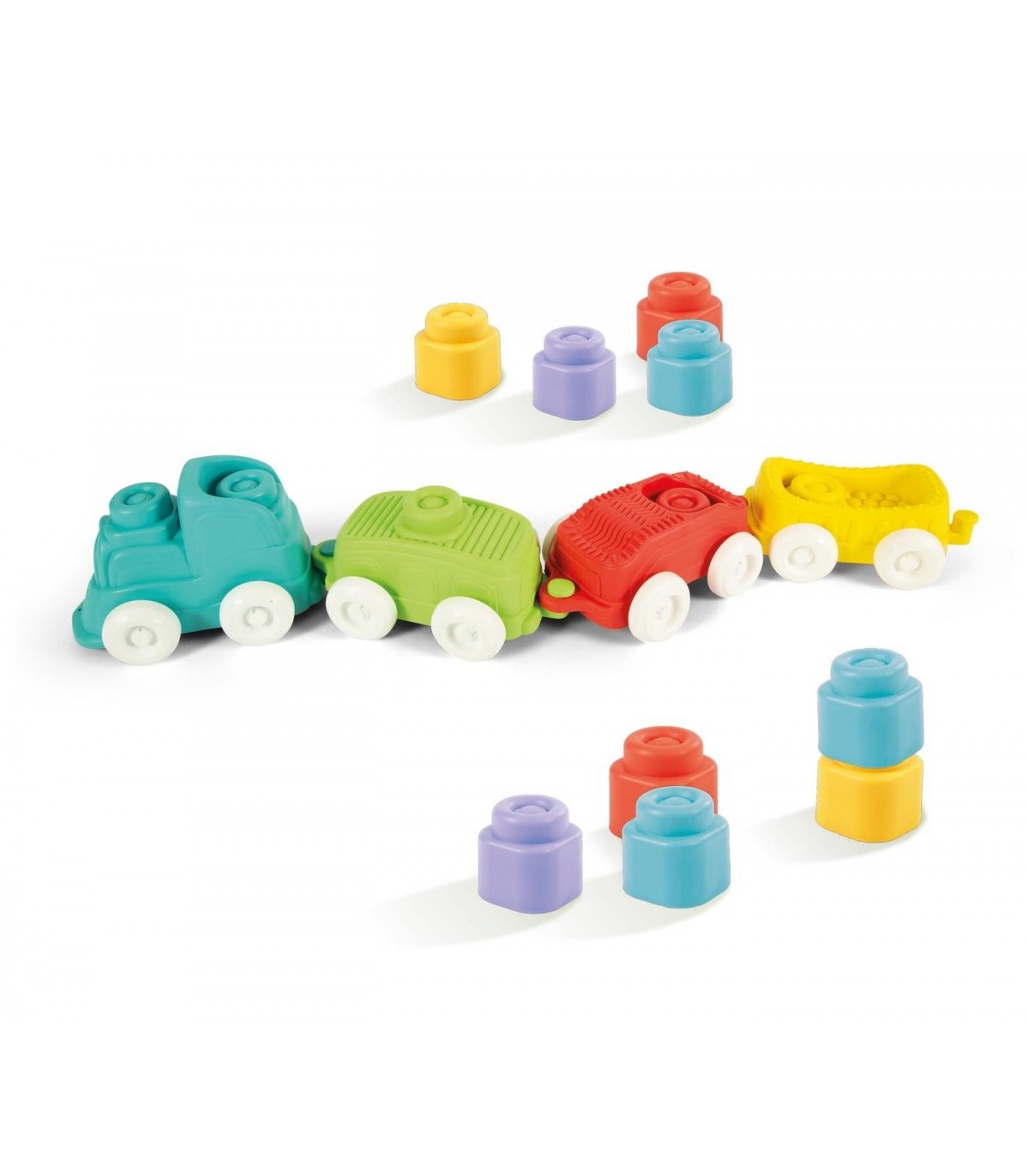¿Sabías que el tacto es el primero de los 5 sentidos que se desarrollan en el bebé? Con el tren sensorial, el bebé experimenta la suavidad de los clemmy y explora el mundo con las manos y los pies. Con la locomotora y los 3 vagones muchas rutas sensoriales y viajes por casa, para una experiencia de juego divertida, estimulante y con total seguridad. También se incluyen 8 ladrillos de limpieza suaves para insertar y apilar. Longitud del tren : 70 cm.
