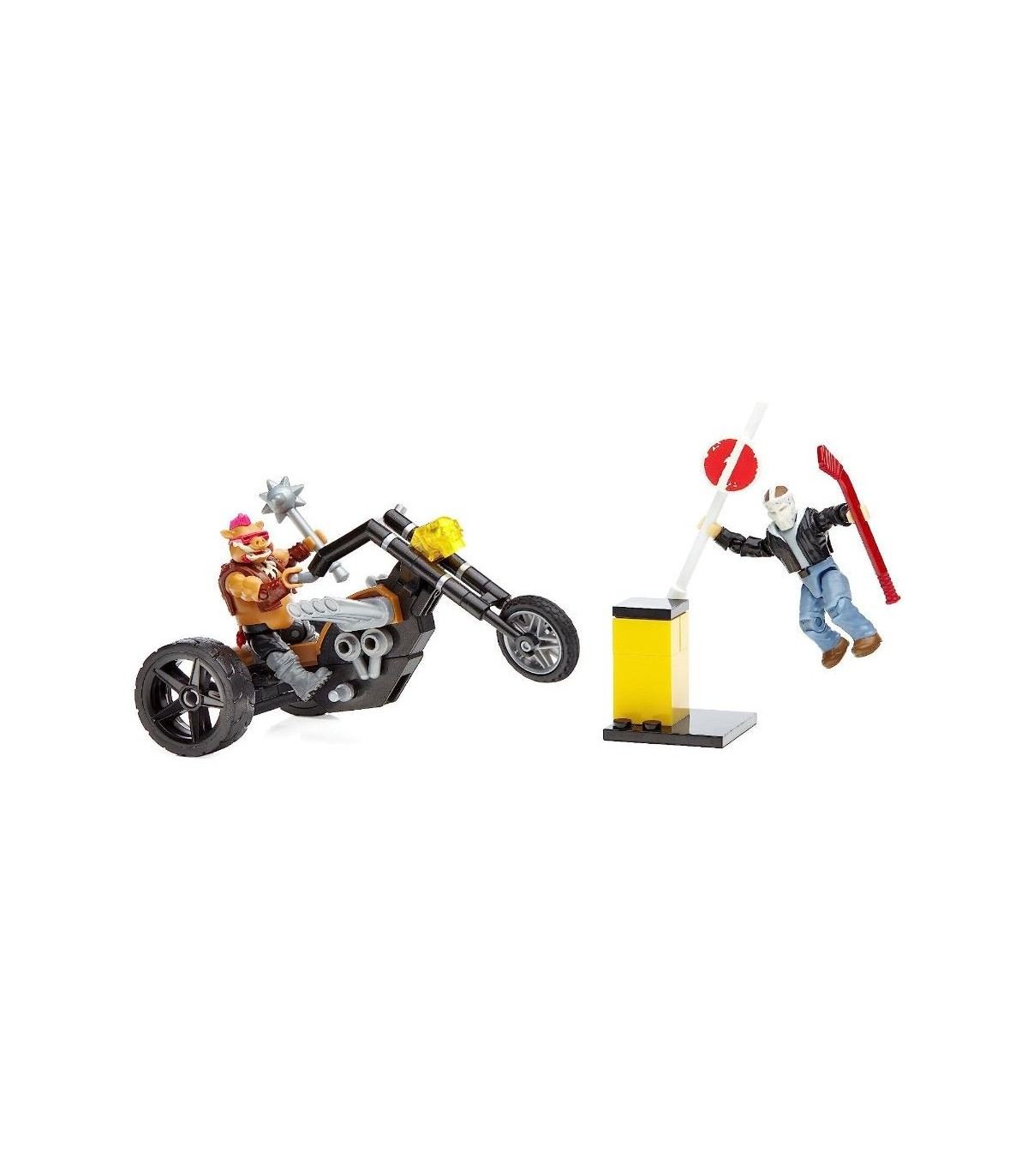La caza está encendida Moto construible con ruedas volantes y luces LED activadas con sensor de choque y torre de aparcamiento con barrera de parada de hilado Dos figuras de acción muy articuladas y construibles Incluye Casey Jones con accesorio para palo de hockey y Bebop con accesorio para palo de hockey