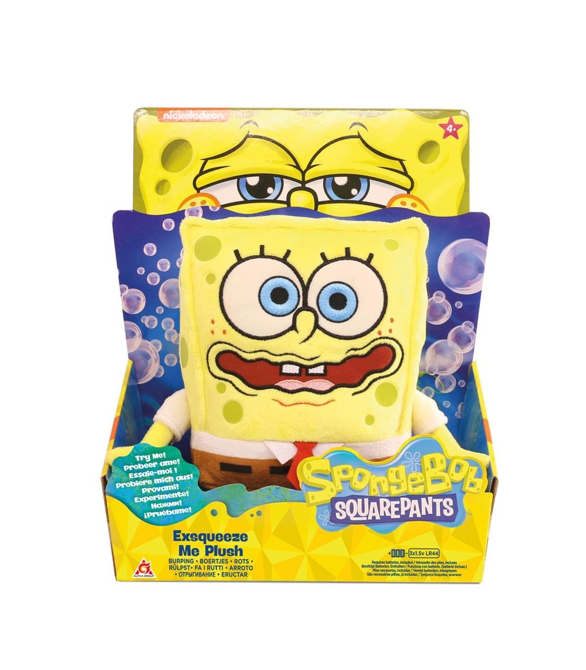 Peluche Bob Esponja con más de 5 sonidos diferentes de eruptos. Diviertete pulsando la tripa y acciendolo sonar.
