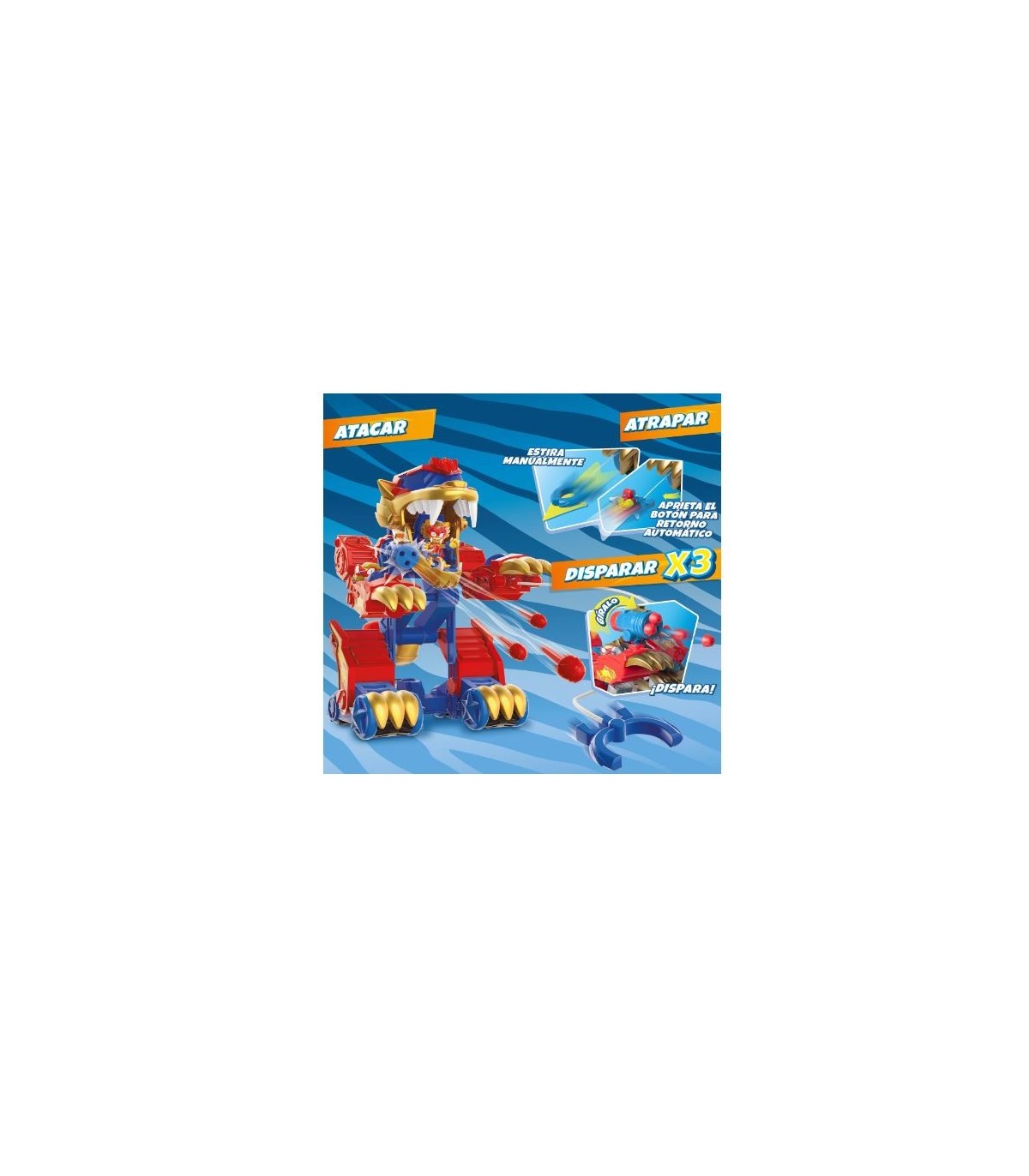 Ahora es un rápido bólido... ¡Y ahora es un robot gigante! La fiera más grande de Kaboom City ha llegado. Y su fuerza es.... ¡bestial!. Se despliega con un solo gesto: aprieta la cola y de la modalidad RACE (vehículo) pasará a la modalidad ATAQUE (robot tigre). Con su garra puede lanzar una pinza para atrapar a los SuperThings, recógela automáticamente pulsando un botón. Además, en la garra de la derecha tiene una metralleta que dispara hasta 3 veces. Contiene 1 Wild Kid y 1 Wild SuperThing exclusivos