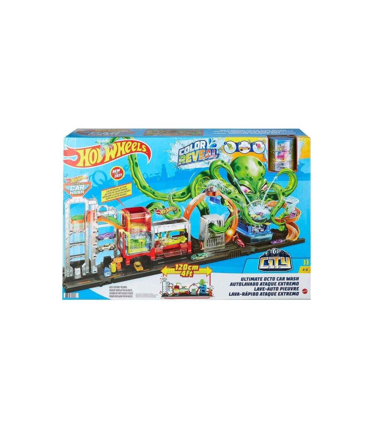Un pulpo gigante ha tomado la ciudad y solo tú podrás derrotarlo en la Pista lavadero de coches Pulpo Color de la colección ciudad de Hot Wheels con los coches Hot Wheels Color Shifters, los cuales revelan decoraciones alucinantes al entrar en contacto con el agua.