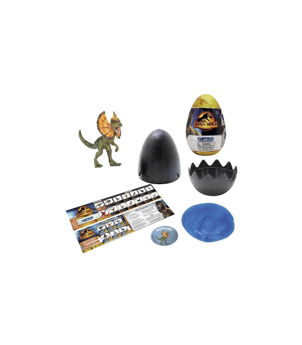 huevo con figura y muchos accesorios de la saga jurasica, incluye slime