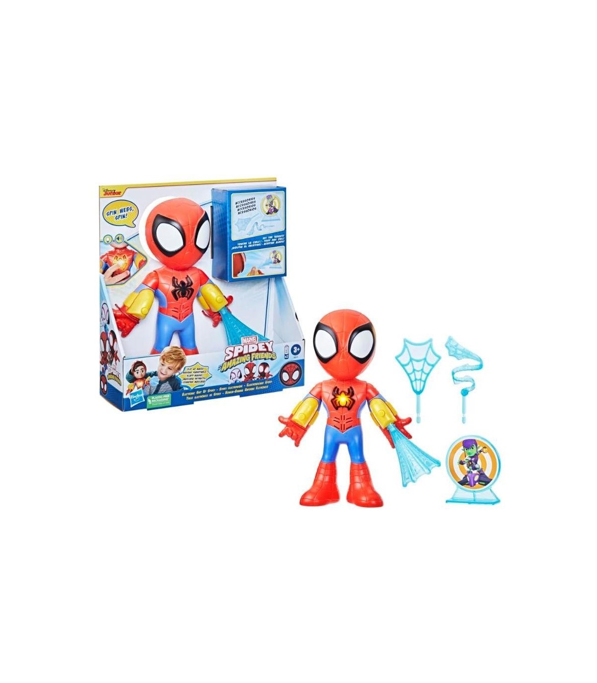 FIGURA DE SPIDEY DE GRAN TAMAÑO: ¡Las manos pequeñas adorarán jugar con esta figura Traje electrónico de Spidey a escala de 25 cm que los niños podrán sostener con facilidad para jugar con ella y exhibirla con sus juguetes Spidey! LUCES Y SONIDOS: ¡Presiona el emblema de Spidey en el tórax de la figura para oír emocionantes frases y sonidos que los niños reconocerán de la exitosa serie de Disney Junior y mira cómo se ilumina la figura! INCLUYE ACCESORIOS PARA INCREÍBLE ACCIÓN ARÁCNIDA: ¡Incluye 2 proyectiles de telaraña y un objetivo con apariencia de Duende Verde para imaginar divertidos enfrentamientos! LA MÁSCARA SE LEVANTA: Los niños pueden levantar la máscara de Spidey para revelar el rostro de Peter Parker COLECCIONA MÁS JUGUETES DEL EQUIPO SPIDEY: ¡Colecciona otros juguetes Marvel de Spidey and His Amazing Friends para muchas horas de diversión con el equipo Spidey! Estas figuras y sets de juego son fantásticos regalos para niños a partir de 3 años que adoran imaginar aventuras de superhéroes con sus personajes favoritos. (Se venden por separado. Sujeto a disponibilidad.)