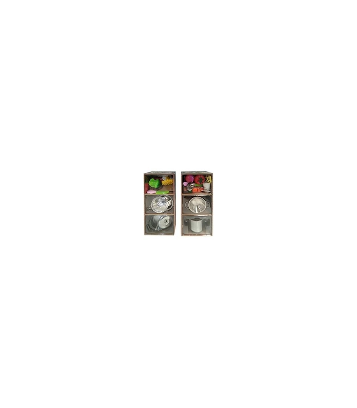 caja con cacharritos de metal y replicas de comida con aspecto realista.