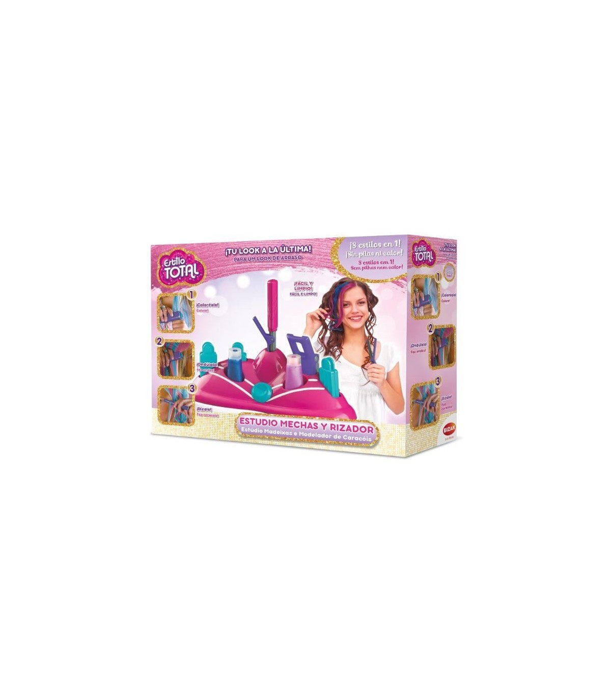 Mechas y rizador Crea tus nuevos looks con este completo set de Estudio Mechas y Rizador 3 en 1. Elige el color que prefieras, aplícalo sobre un mechón de tu pelo utilizando la tenaza y ya estarás lista para lucir mechas de color, pero además puedes riza u ondular tu pelo solo unos segundos.