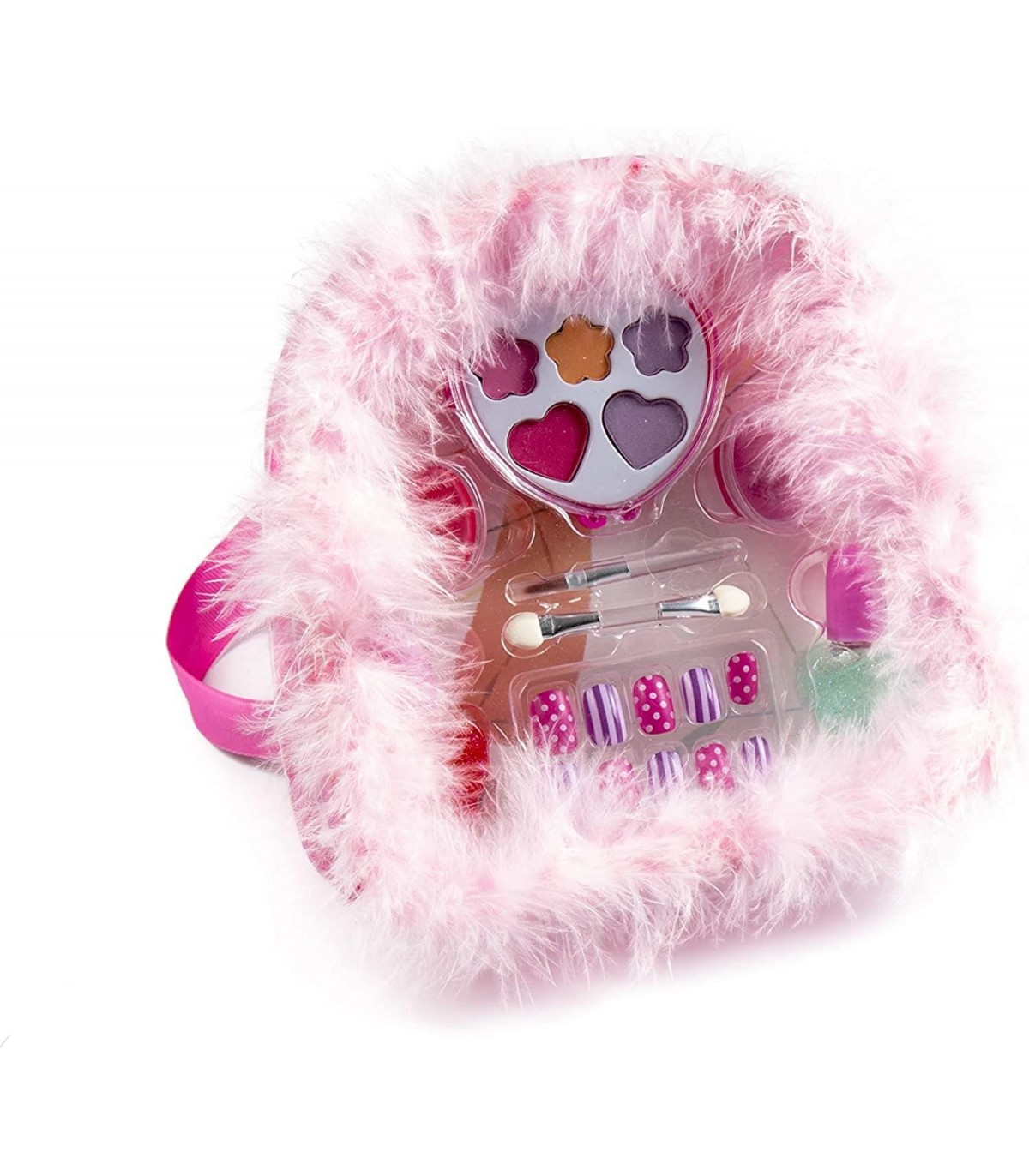 Mochila con set de maquillaje princess, pequeña mochila con plumas, contiene uñas postizas y maquillaje.