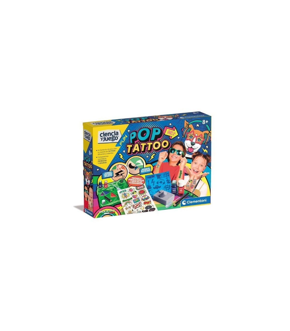 Haz tus propios tatuajes temporales y calcamonías con Pop Tatoo de Clementoni. La tattoo manía ha estallado. Vamos a divertirnos creando magníficos tatuajes al estilo pop. Llos niños y niñas podrán crear tatuajes personalizados. Con este kit los niños y niñas podrán decorar su cuerpo con tatuajes de colores o calcomanías y optimizar sus habilidades manuales haciendo moldes de yeso para pintar de distintos colores. No solo aprenderán el arte del tatuaje, sino historia y ciencia. El manual ilustrado introducirá al niño en el mundo de los tatuajes, su origen y los diferentes estilos. El kit contiene: un banco de trabajo de tatuador, colorantes líquidos, esponjas, lápiz, pinceles, tatuajes y plantillas de calcomanías, yeso y moldes. Con Clementoni Ciencia y Juego, aprenderán los secretos científicos con total seguridad. Desarrollarán su imaginación, su creatividad, autonomía y capacidad decisional. Un juego ideal para utilizar en familia o con amigos, para poder compartir sus creaciones