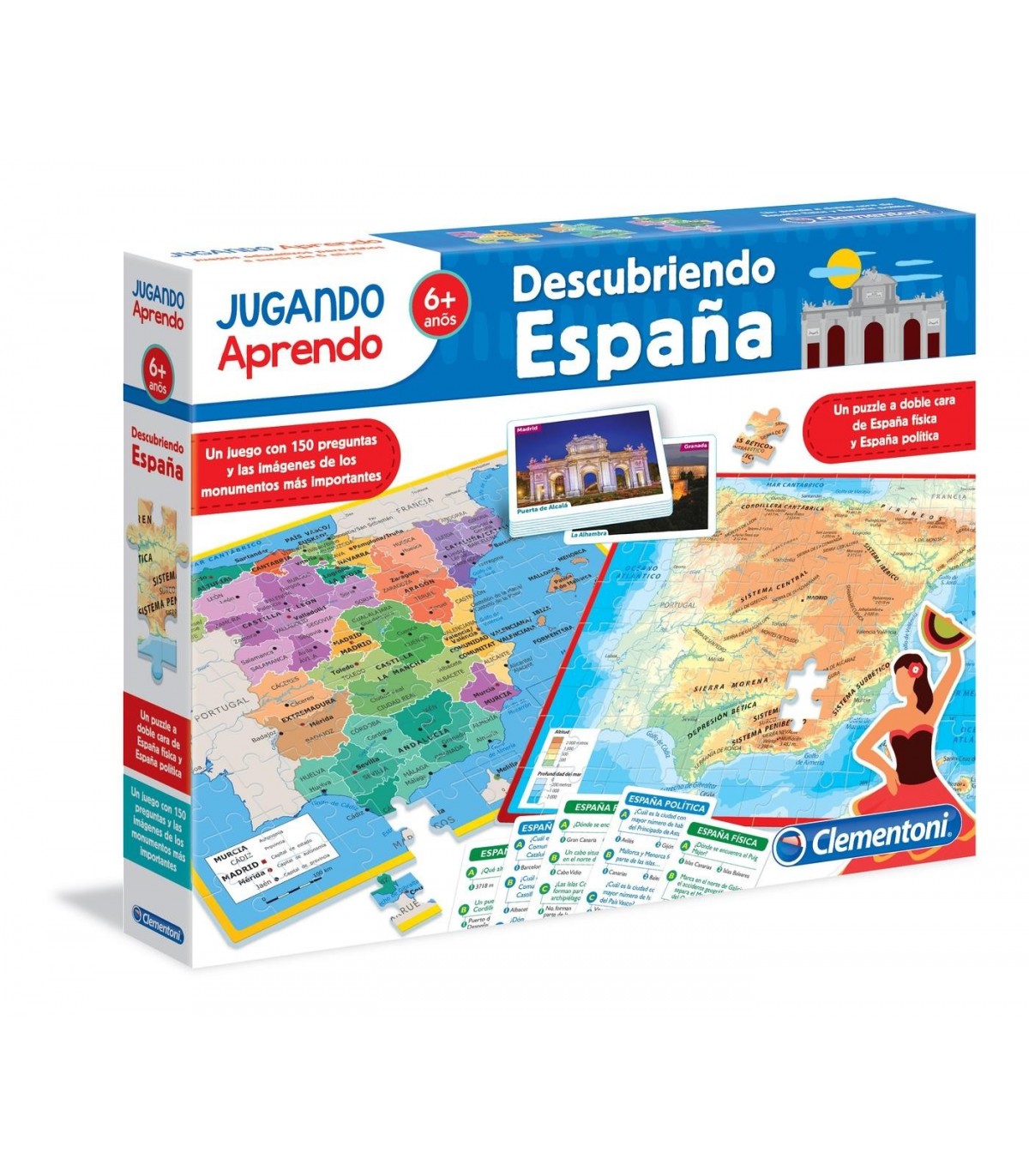 Este fantástico juego 2 en 1 es un puzle de dos caras con el mapa físico y político de España y un divertido juego de cartas para ponerse a prueba y descubrir muchas curiosidades y datos sobre nuestro país.