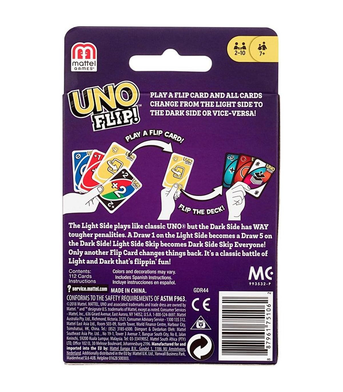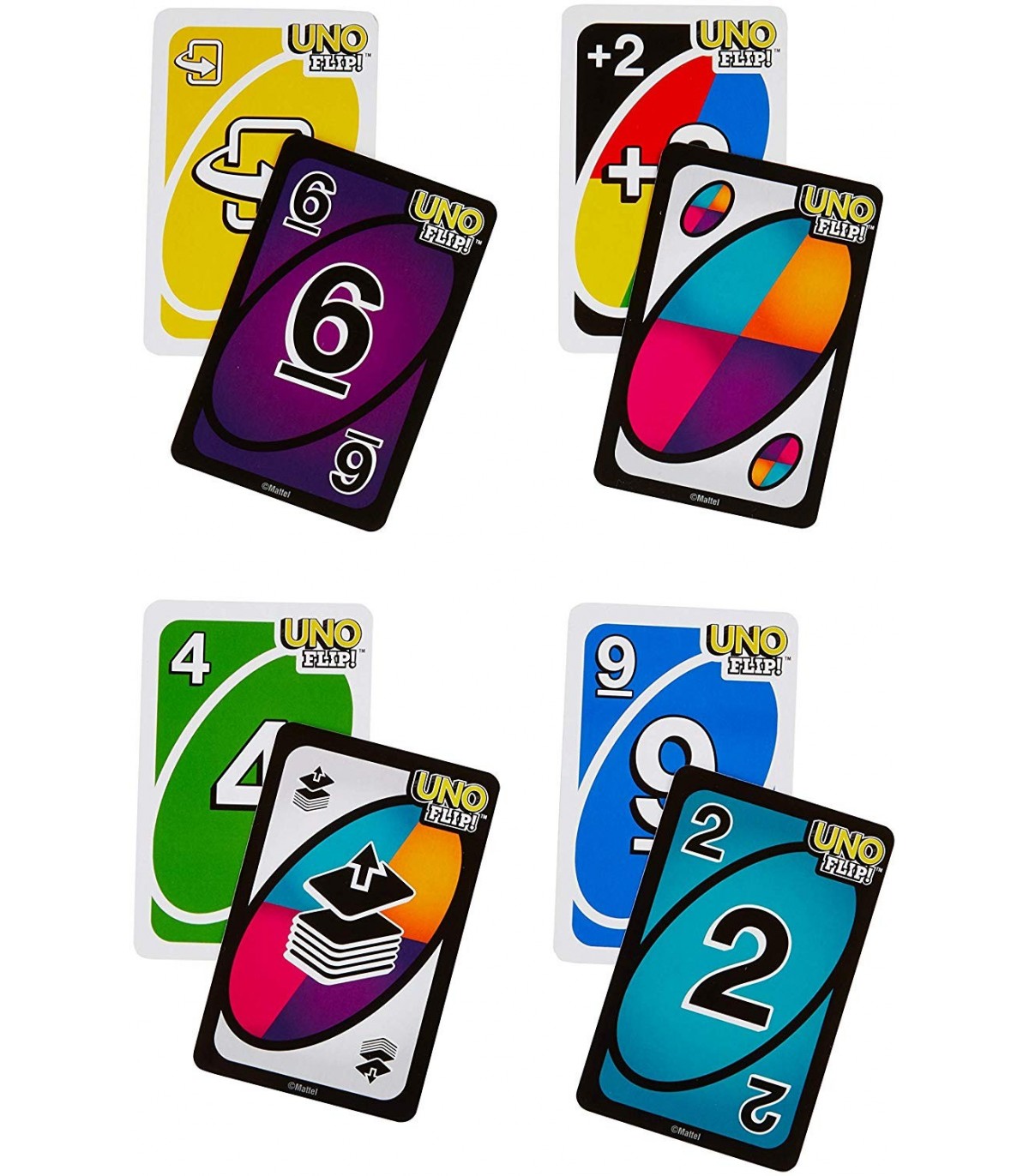 nueva version del juego uno, ahora las cartas tienen dos caras para dar mas emocion a los juegos, cuando aparece la carta especial todos tienen que dar la vuelta a las que tienen