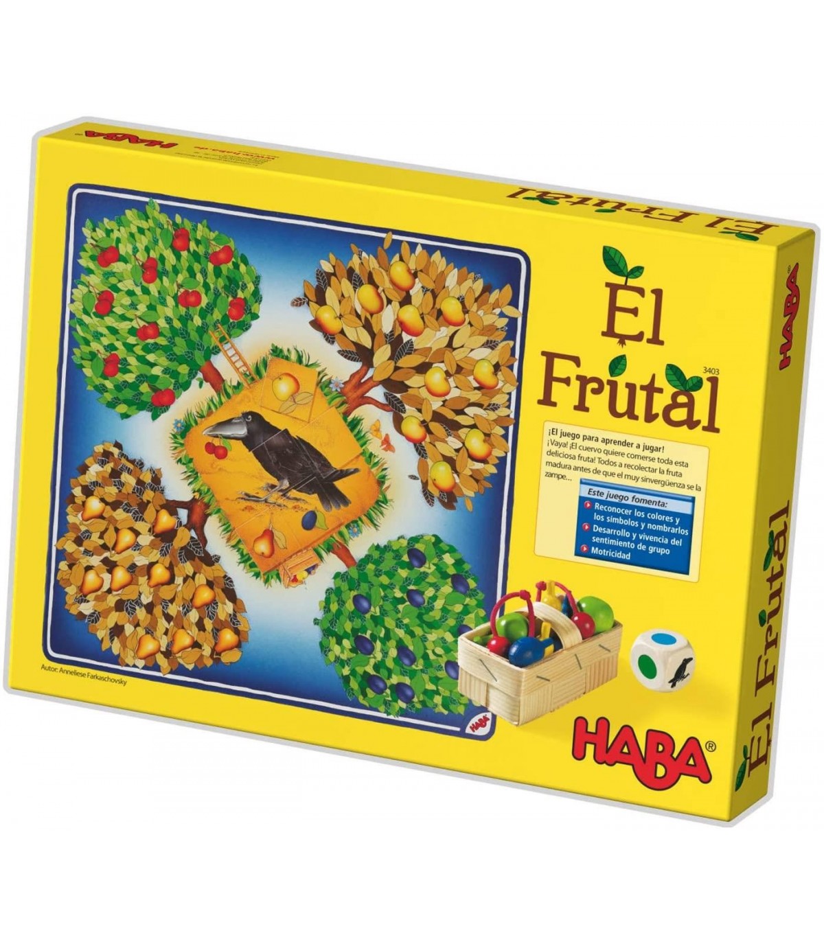 Divertido juego infantil de cartas pensado para los mas pequeños. 10 manzanas, 10 peras, 10 pares de cerezas, 10 ciruelas, 4 cestas para recolectar la fruta, 1 puzzle del cuervo (9 piezas), 1 dado de colores y símbolos, 1 tablero, instrucciones del juego.