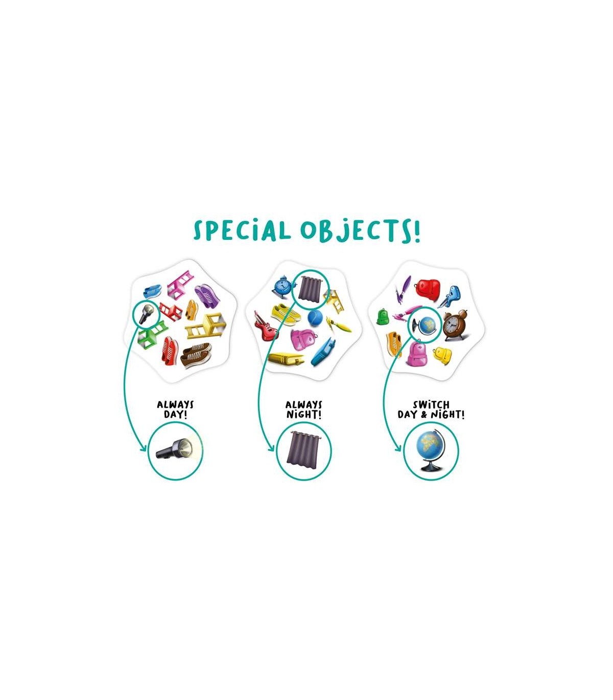 Juego de percepción y reacción en el que gana quien acumule más cartas. Los objetos especiales cambian lo que se debe buscar en las cartas.
