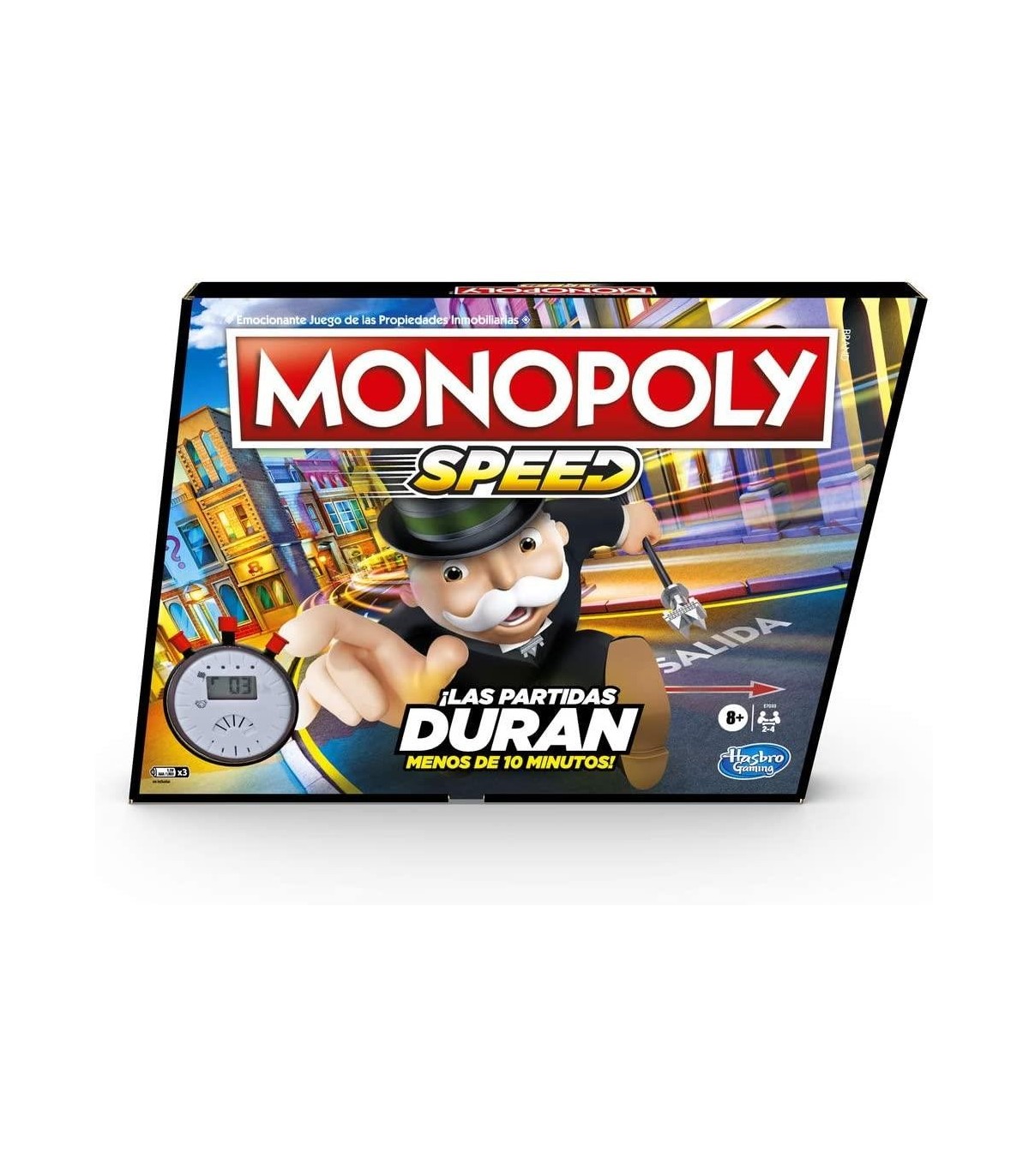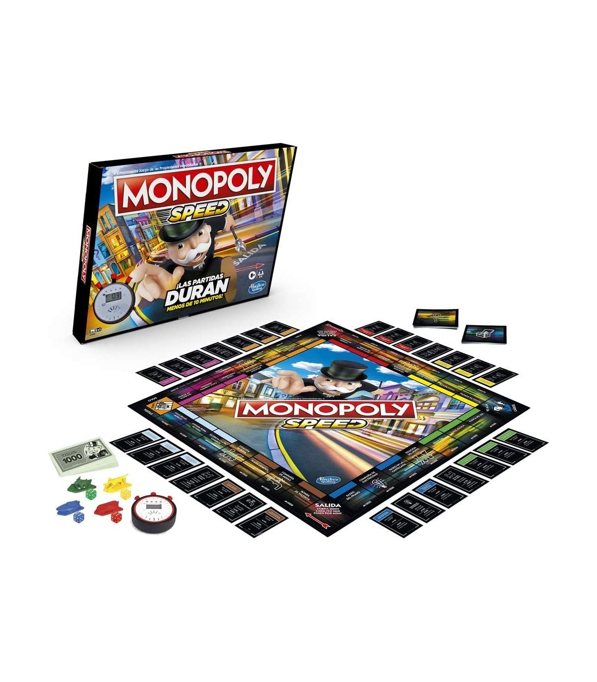 JUEGA EN MENOS DE 10 MINUTOS: Quieres jugar Monopoly pero no tienes mucho tiempo; los jugadores realmente pueden terminar el juego de mesa Monopoly Speed en menos de 10 minutos JUEGA EN RONDAS CRONOMETRADAS: Este juego de mesa Monopoly rápido se juega en rondas; el cronómetro hace una cuenta regresiva de cada etapa de compra y negociación TODOS COMPRAN A LA VEZ: No es necesario esperar tu turno, cada jugador tiene una ficha y un dado correspondiente; durante las etapas de compra, todos tiran y compran a la vez NEGOCIACIÓN SÚPER RÁPIDA: Las tarjetas de Fortuna ayudan a los jugadores a pactar durante cada etapa de negociación; obtén extras al final del juego con las tarjetas de Caja de comunidad DIVERTIDO JUEGO FAMILIAR: El juego Monopoly Go Green es una gran opción para una noche de juegos familiares; el juego es para 2 hasta 6 jugadores, de 8 años en adelante