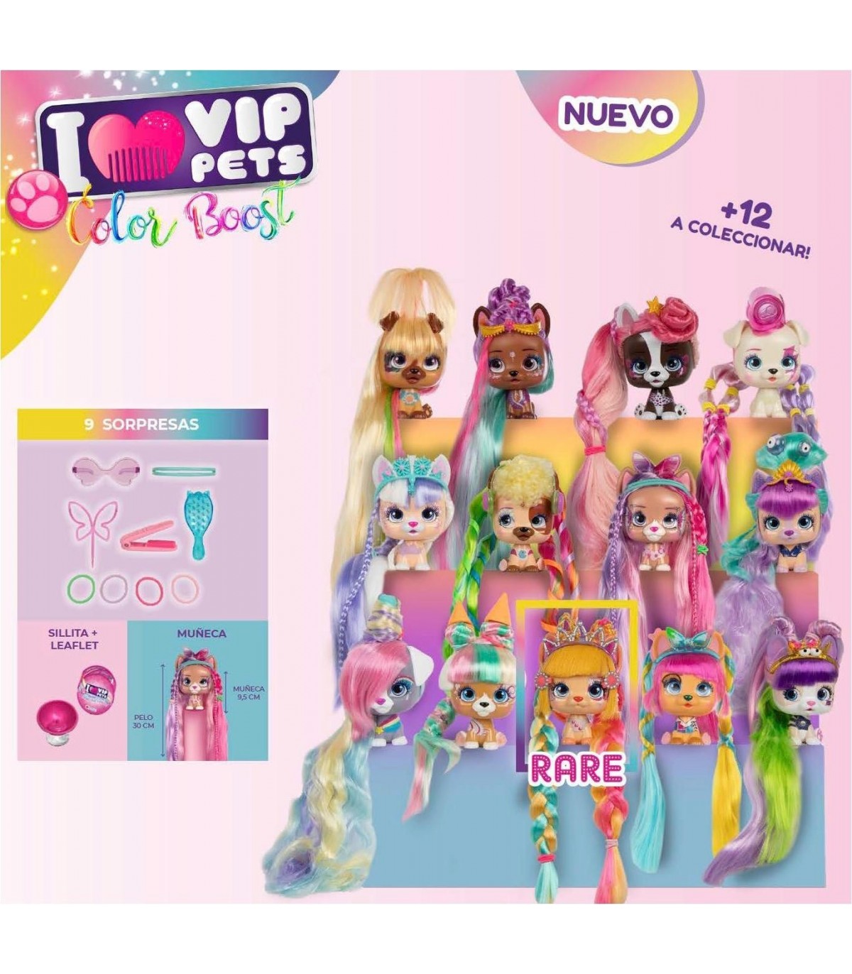 ¡Las VIP Pets están de vuelta con un nuevo Color Boost y una colección de más de 12 muñecas nuevas! ¡Las muñecas perfectas para niños de 4 a 6 años que quieran sentirse como auténticos peluqueros y les guste atreverse con infinitos colores! En esta series, las Mascotas VIP se hacen famosas y necesitan potenciar su estilo con nuevos peinados de colores, como en la webserie de YouTube. Los 9 personajes anteriores vienen con un nuevo look y 3 nuevas mascotas se unen al grupo: Wanda, Bianca y Jazzy. Cada muñeca incluye 9 sorpresas para descubrir y 6 accesorios diferentes para crear un peinado en concreto, ¡pero hay muchas posibilidades! Todas ellas incluyen un accesorio de color para teñir sus 30 cm de cabello. Vienen en un nuevo champú cubierto por una cortina iridiscente como en el Talent Show de la webserie. Tus pequeños deberán girar el tapón de su champú y poco a poco, la cortina brillante desaparecerá y descubrirá el personaje sorpresa. Además, podrán conseguir el personaje exclusivo Shiara, ¡con más accesorios y con pelo que cambia de color! (modelo sorpresa, éste no puede ser solicitado). También se incluye una silla para facilitar el peinado de la muñeca. ¡Con Vip Pets puedes convertirte en un auténtico peluquero como Fabio y Fabia!