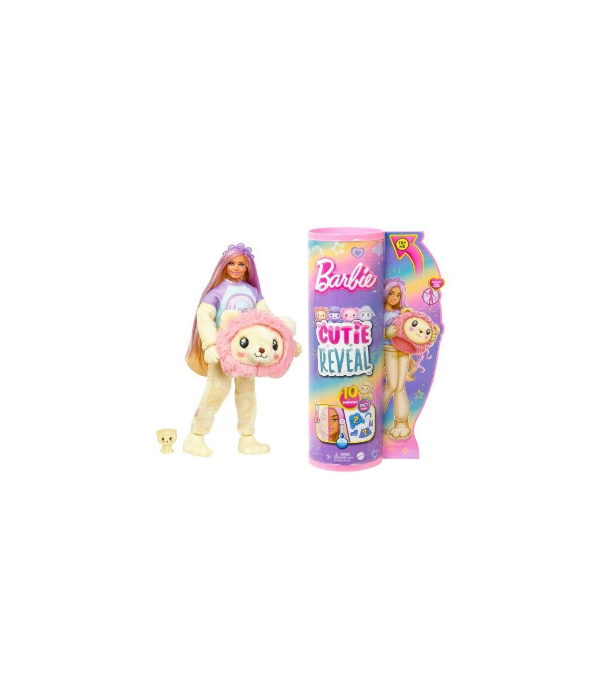 Abrir la caja de las muñecas Barbie® Cutie Reveal™ Cozy Cute Tees™ será una experiencia espectacular. ¡Hay diez sorpresas diferentes! Descubre a un tímido león que lleva una camiseta con la palabra “Hope” bordada. Quítale el disfraz de peluche y descubrirás una muñeca Barbie® articulada con una larga y colorida melena. Acomódate y descubre más sorpresas, como una diadema, una falda satinada y una minimascota a juego. Dale la vuelta a la parte superior del disfraz de peluche para convertirlo en una chaqueta polar y usa la cabeza como una cama para mascotas. El agua muy fría hace que el pelo de la muñeca y la minimascota sean aún más adorables, ya que cambian de color, y el agua caliente los devuelve a su color original para que la diversión se repita. A niños y niñas les encantará descubrir todas las encantadoras sorpresas de la serie más cómoda y adorable de Barbie® Cutie Reveal™. Incluye una muñeca vestida con un disfraz de animal y 10 sorpresas.