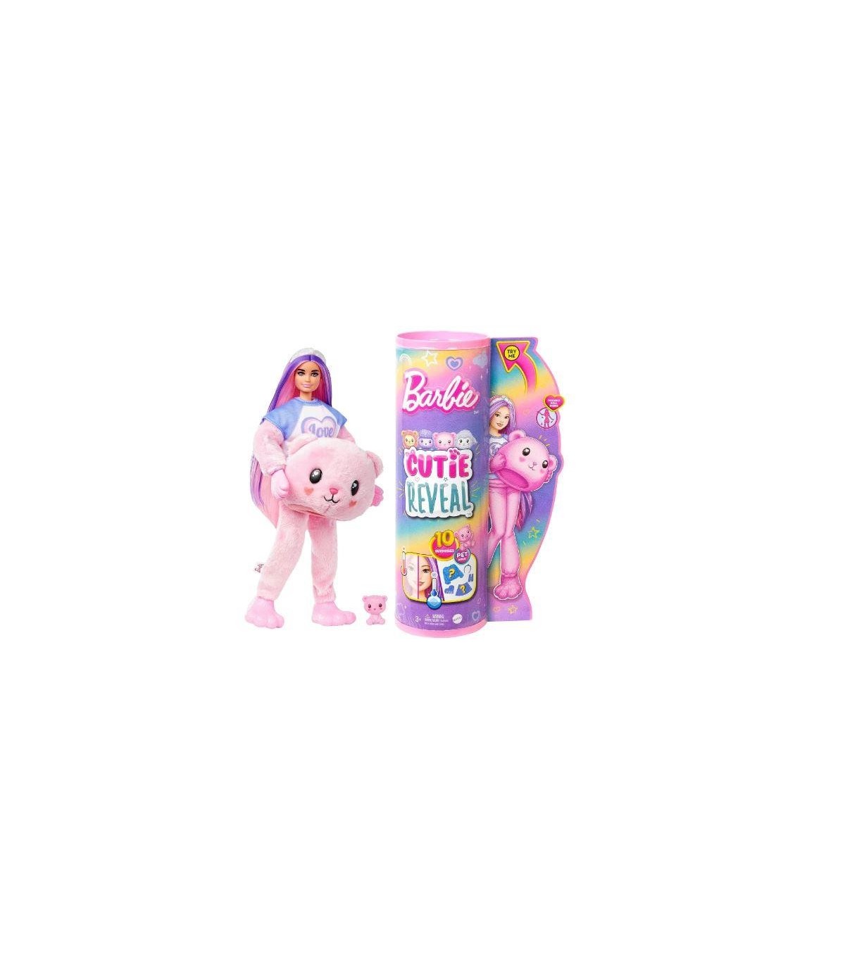 Gracias a las diez sorpresas incluidas en un único paquete, abrir la caja de las muñecas Barbie Cutie Reveal de la serie Cozy Cute Tees es una experiencia de lo más adorable. Descubre en su interior suaves animales de peluche, prendas de ropa y sorpresas, y disfruta con las divertidas transformaciones. Qué muñeca te tocará? Abre la caja para descubrir a un achuchable osito rosa de peluche con una colorida camiseta con un inspirador mensaje, “Love”. El osito es un disfraz que oculta una muñeca Barbie en su interior. Retira la cabeza del disfraz y descubre a la muñeca Barbie, con una melena larga y rosa con mechas moradas, nueve puntos de articulación y detalles brillantes en la cara. Abre las cuatro bolsas sorpresa para encontrar ropa y accesorios, como una falda satinada, una diadema Barbie, un par de zapatos, un peine de esponja y un adorable miniosito a juego.