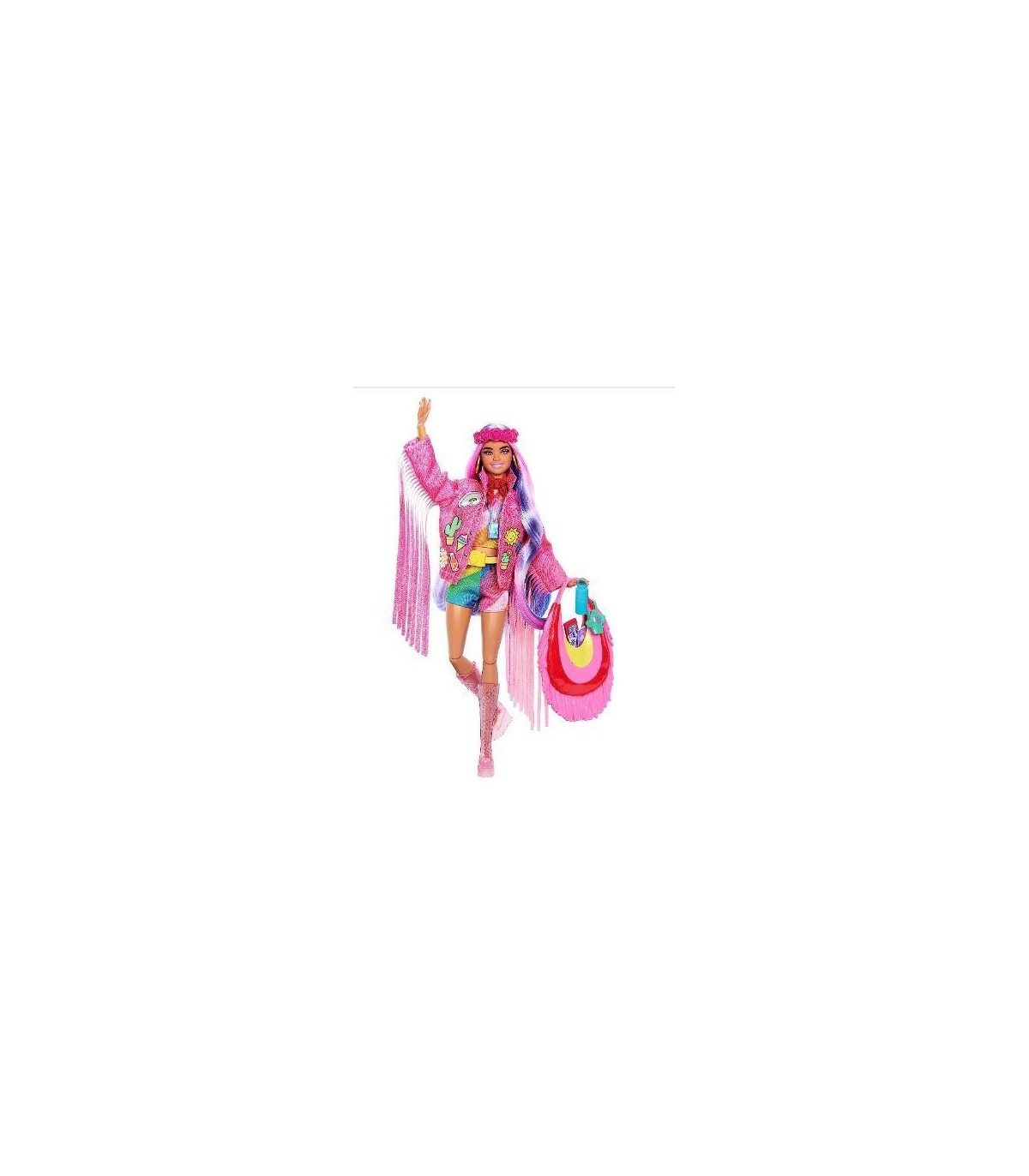 Las muñecas Barbie Extra Fly están listas para ir de vacaciones con conjuntos a la moda y mucho estilo; cada muñeca viene con accesorios de viaje y prendas que son toda una declaración de intenciones ¡Barbie va al desierto con su conjunto de festival! Esta muñeca con puntos de articulación está lista para vivir divertidas aventuras Luce con confianza un estilo desenfadado con el pelo largo rosa y morado, una chaqueta vaquera rosa con flecos y parches de colores, un conjunto de rayas de varios colores a juego y botas rosas ¡Todo es cuestión de los detalles EXTRA! La muñeca Barbie viene con 15 accesorios, como una corona de flores rosas, una insignia VIP, unas gafas de corazón y una riñonera para la cámara, para expresarse a través del estilo y divertirse combinando Los accesorios de viaje son óptimos para contar historias; esta muñeca festivalera incluye un bolso extragrande con flecos, una etiqueta de equipaje de cactus, un pasaporte, un billete de avión, un teléfono y una botella de agua
