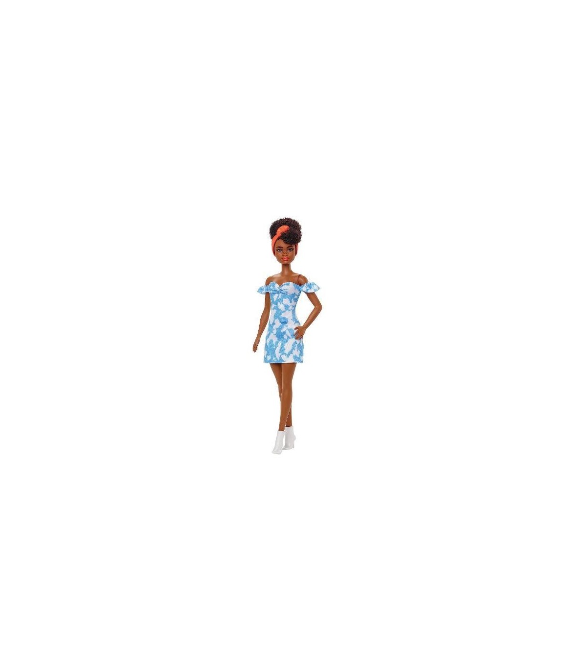 La última colección de muñecas Barbie Fashionistas incluye muñecas con cuerpos de todo tipo, una gran variedad de tonos de piel, peinados, y colores de ojos y de pelo, y un montón de conjuntos a la última. La muñeca Barbie tiene un cuerpo original y lleva un vestido vaquero blanqueado de hombros descubiertos con unas preciosas botas blancas a juego. Recogido hacia arriba, su cabello negro está acentuado con un pañuelo naranja que completa el look moderno con un toque de color.
