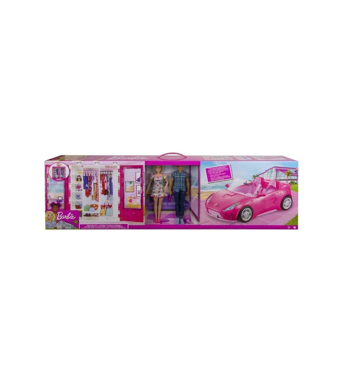 Muñeca Barbie y ken con su armario y coche descapotable rosa de dos plazas. Incluye accesorios.