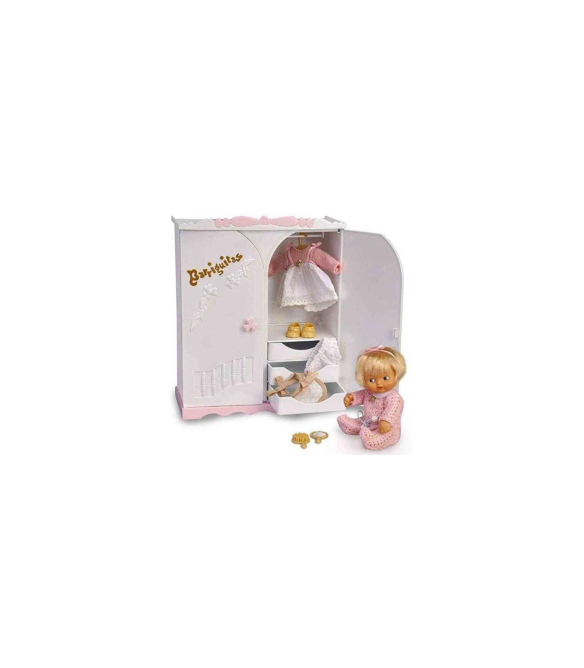 Elegante armario blanco de estilo clásico, decorado con detalles en rosa y dorado. El armario tiene un espejito en la puerta y cajones para guardar los accesorios pequeños. También incluye ropita extra, perchas y pequeños accesorios. Viene con un bebé Barriguitas con pelo vestido con un body de punto de tono rosa.