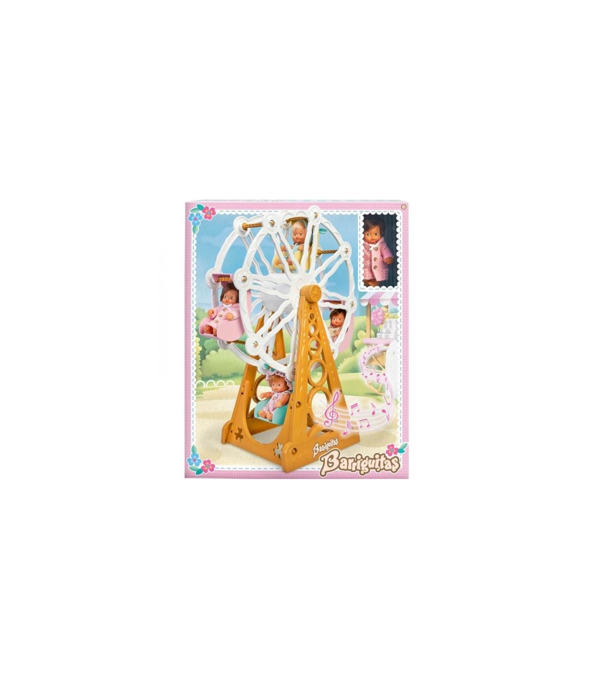 ¡La nueva noria de Barriguitas es alucinante, es como una noria de verdad! Con ella podrás ampliar tu mundo Barrigitas y montar en ella hasta 4 Barriguitas a la vez (este set solo incluye una muñeca). Para hacerla funcionar, sólo tendrás que darle cuerda y montar a tus Barriguitas en sus asientos, la noria empezará a girar mientras suena una bonita canción. Incluye 4 asientos de diferentes colores que se pueden quitar y jugar con ellos fuera de la noria. Incluye una exclusiva y bonita muñeca con el pelo castaño y una chaquetita de punto. ¡Todo listo para pasar horas de diversión con tus Barriguitas! Edad recomendada: + 3 años. No recomendable para menores de 3 años, ya que contiene piezas pequeñas que podrían provocar asfixia en caso de ser ingeridas por el niño/a.