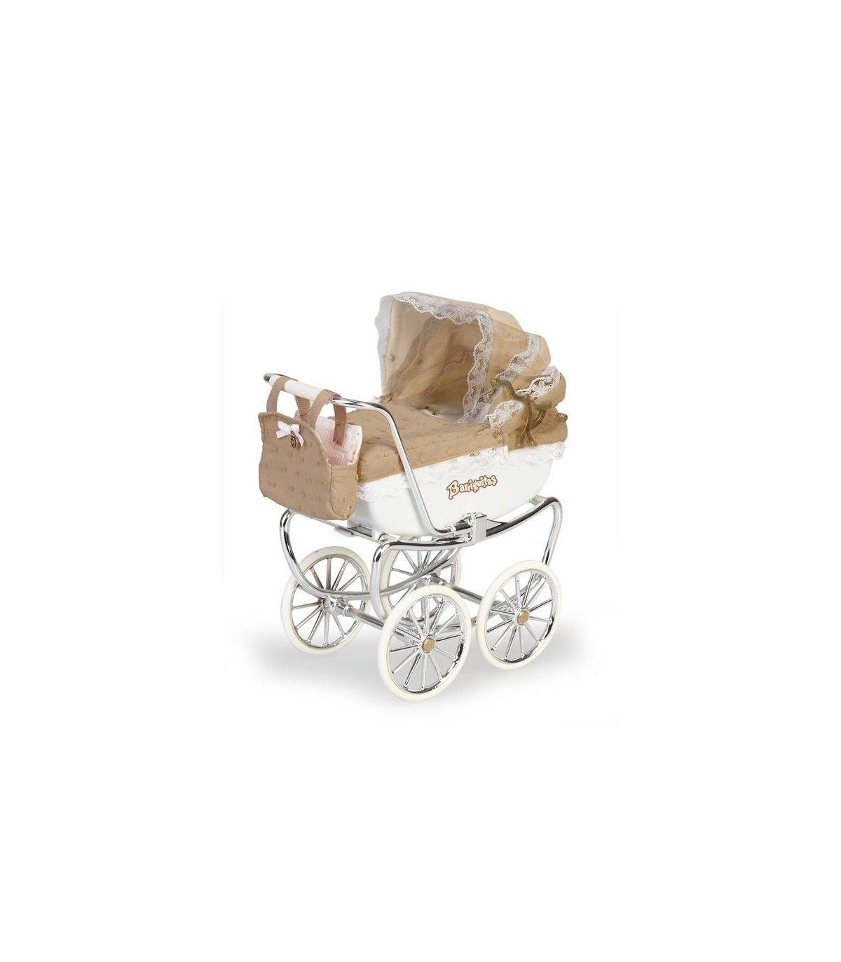 El Carrito para los bebés Barriguitas es el accesorio perfecto para jugar a dar un paseo con tus muñecas El carrito tiene una estética tradicional y muy cuidada con detalles en blanco y dorado y acabado metalizado , como los carritos de verdad La capota es de tela de color beige con detalles bordados. Se puede subir y bajar Tiene una bolsa de tela para guardar los accesorios como el biberón y el chupete El set incluye un precioso conjunto para tu bebé barrigitas, compuesto de un vestido rosa con un pichi blanco