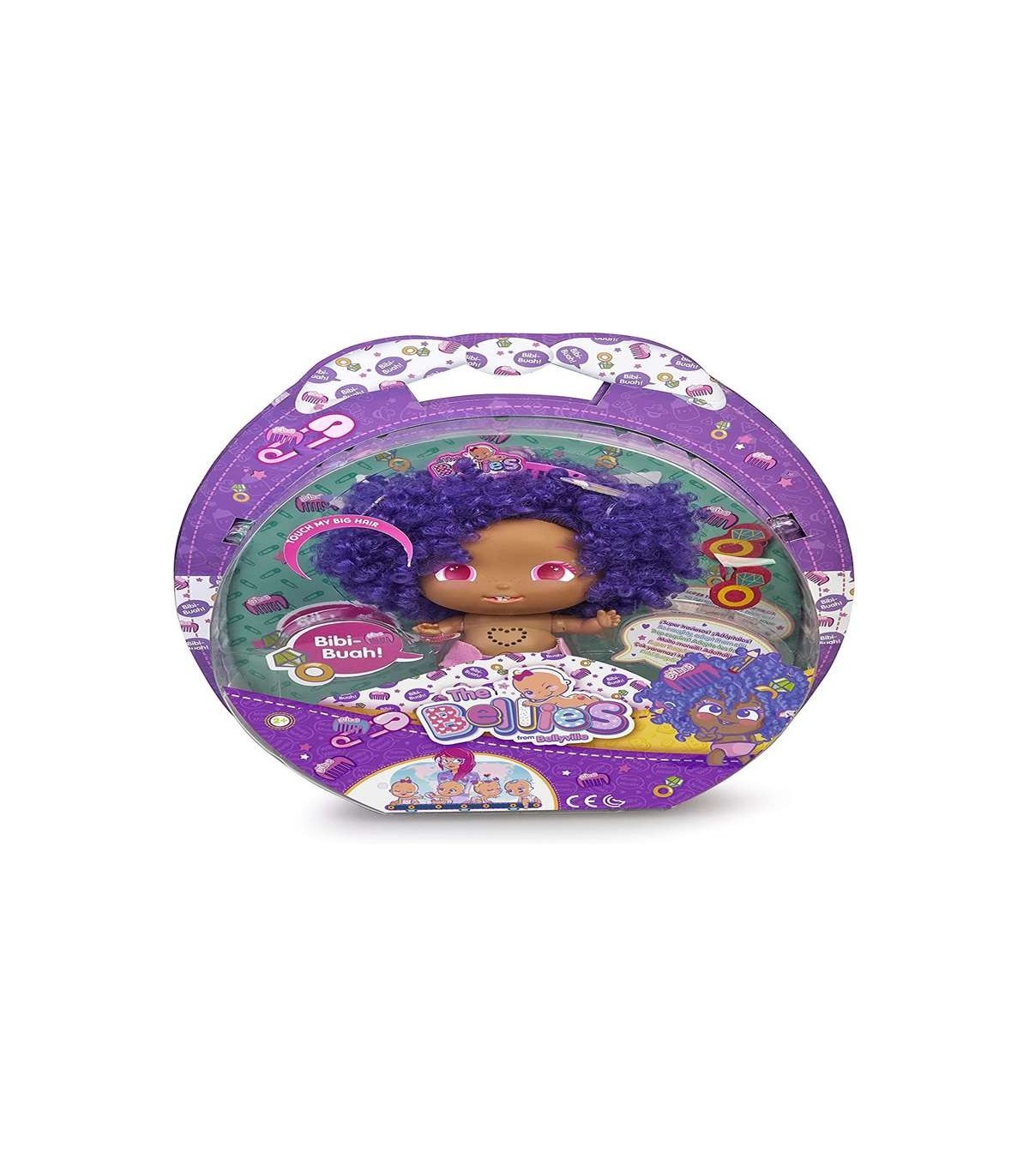 Bibi-Buah Es un Bellie en Bellyville; le gusta el rap, y tiene el pelo rizado de color violeta Los Bellies son los muñecos interactivos más revoltosos, traviesos y divertidos listos para adoptar; cada Bellie tiene su propia personalidad, pero si hay algo que tienen en común son sus travesuras Los Bellies están llenos de sorpresas, al quitarles el cordón umbilical escucharás el latido de su corazón, luego empezará a hablar y también tendrás que ver su marca de nacimiento que encontrarás al quitarle el pañal Incluye a Bellie Bibi-Buah; su peine y su coletero
