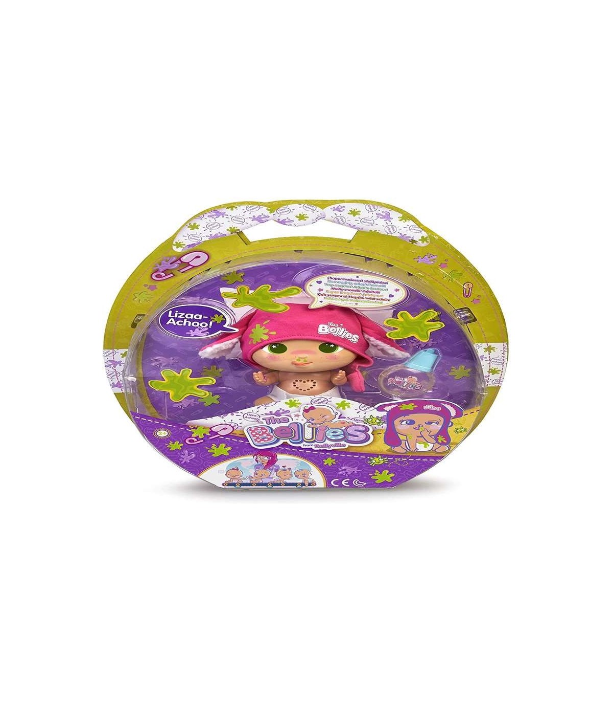Liz-Achooo Es un Bellie en la familia de Bellyville; siempre tiene moquitos y viene con ropita de invierno, un succionador de mocos y su chupete Los Bellies son los muñecos interactivos más revoltosos, traviesos y divertidos listos para adoptar; cada Bellie tiene su propia personalidad, pero si hay algo que tienen en común son sus travesuras Los Bellies están llenos de sorpresas, al quitarles el cordón umbilical escucharás el latido de su corazón, luego empezará a hablar y también tendrás que ver su marca de nacimiento que encontrarás al quitarle el pañal Incluye a Bellie Lizzz-Achoo, su chupete y su succionador de mocos divertido