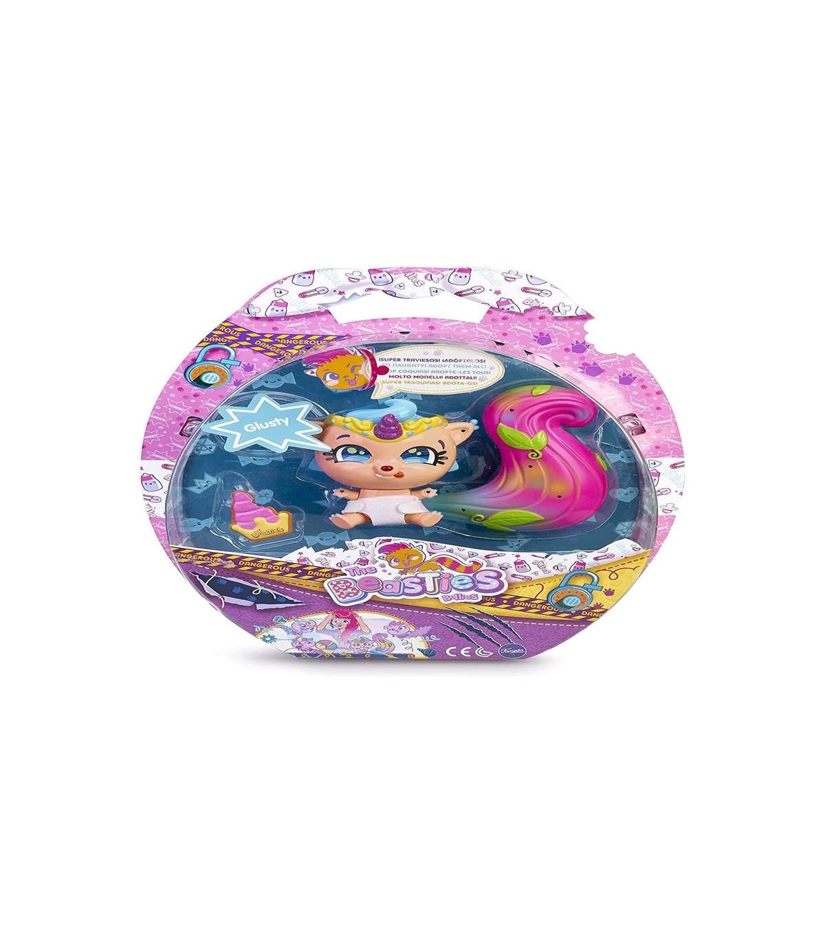 Los Beasties son los mejores amigos de los Bellies, les encanta quitarles las cosas a los Bellies y son aún más traviesos Los Glusty son los Beasties con más imaginación; son tan fantasiosos que creen que pueden hasta volar; un día se creen un hada y al siguiente un unicornio así que cuidado con que no se crea que puede volar Los Beasties tienen su propia experiencia, primero tendrán que quitarles una pequeña bacteria que traen y agitarlo para comprobar que no quedan más, después ponerle su propio nombre, fijarse en el chip para saber que raza les ha tocado y luego ver que caquita tiene en su pañal Cada Beastie viene con su accesorio, pañal y su Beastiepedia