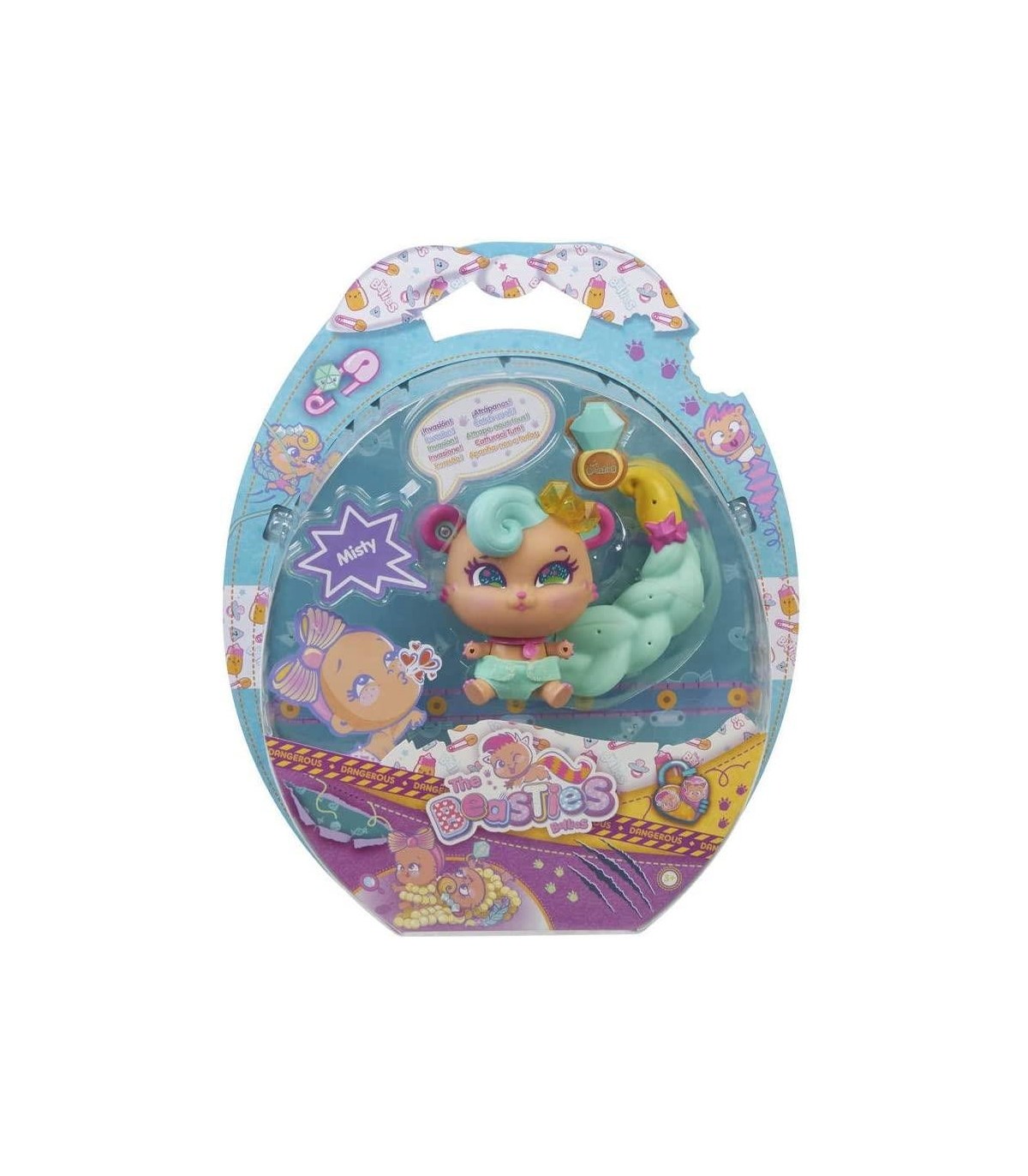Los Beasties son los mejores amigos de los Bellies, les encanta quitarles las cosas a los Bellies y son aún más traviesos Misty es la raza más presumida de todos los Beasties Cualquier cosa que parezca una joya va a querer que sea suya y que no te extrañe que se las ponga como accesorios Los Beasties tienen su propia experiencia, primero tendrán que quitarles una pequeña bacteria que traen y agitarlo para comprobar que no quedan más, después ponerle su propio nombre, fijarse en el chip para saber que raza les ha tocado y luego ver que caquita tiene en su pañal Cada Beastie viene con su accesorio, pañal y su Beastiepedia