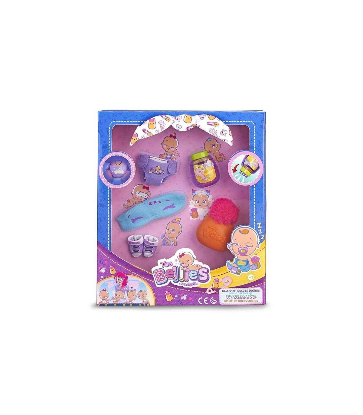 Los Bellies son los muñecos interactivos más revoltosos, traviesos y divertidos listos para adoptar; El Bellie Kit Dulces sueños es el kit más divertido para preparar a tus Bellies para irse a la cama El Bellie-Kit Dulces Sueños incluye Bellie esponja para su baño, polvos divertidos de talco, pañal especial moradito de noche y calcetines monísimos para que tu Bellie tenga sus pies calentitos Incluye antifaz para intentar que se queden tranquilos Regalo óptimo para niños a partir de 3 años que adoran a los Bellies y sus historias divertidas Kit de accesorios de noche para Bellies de 17 cm, funciona sin pilas