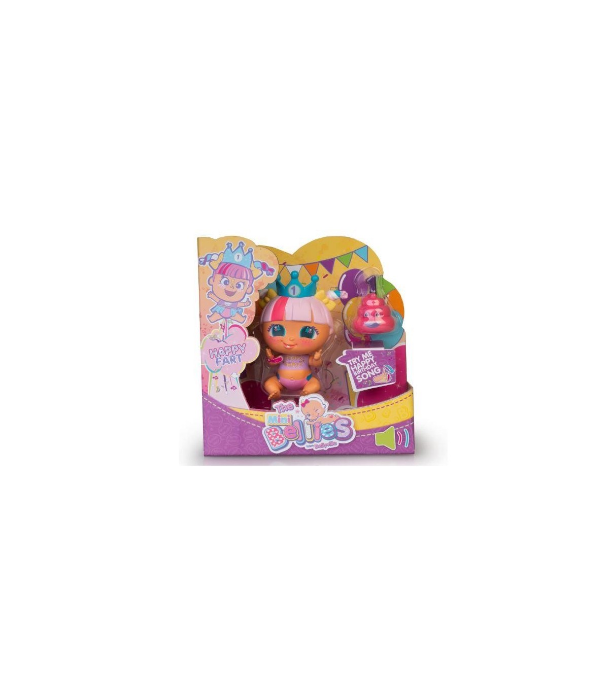 Los Mini Bellies son los hermanos traviesos de los Bellies; Happy Fart es la nueva mini Bellie de la colección, con un juego súper divertido que encantará a los más pequeños Esta muñeca Bellie está celebrando su primer cumpleaños, es tan traviesa como todos los bebés Bellies y se tira pedetes en vez de cantar el cumpleaños feliz Para activarla, tira de su brazo y escucha un pedo musical o tira varias veces para escuchar la canción completa del cumpleaños feliz con pedetes La muñeca tiene una corona de cumpleaños y dentro del juguete también encontrarás una tarta de cumple con forma de caca rosa y una vela con un 1