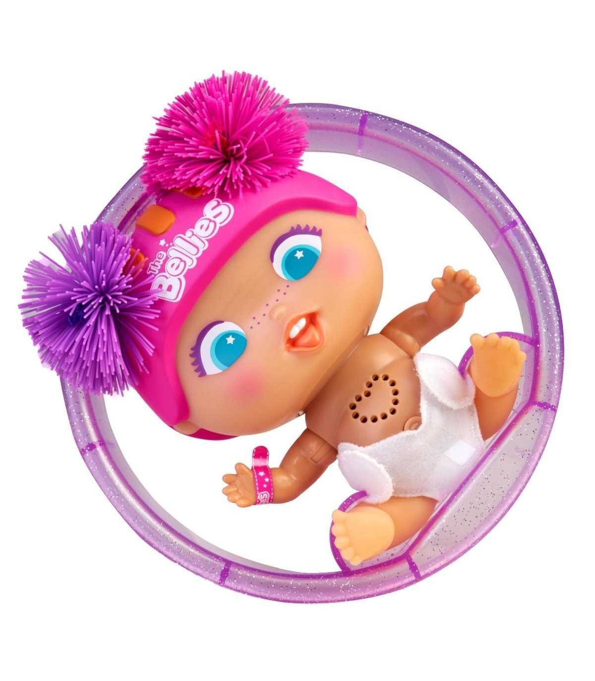 ¡Hula- hoop! Es una Bellie super divertida que incluye un aro morado! ¿Cómo funciona? ¡Solo pon a Hula-hoop! dentro del aro, tíralo y ella rodará y rodará. Hula-hoop! es una Bellie súper mona con un casco rosa y lazos. También puedes sacarla del aro y tiene las mismas características que los otros Bellies; puedes escuchar los latidos de su corazón y hablará de una manera única y divertida, además tiene una bonita marca de nacimiento que se puede encontrar cuando le quitas el pañal. En el pañal también encontrarás una graciosa sorpresa; Visita la Poopypedia en la Bellypedia para descubrir qué cuidados divertidos debes aplicar. Hula-Hoop! es perfecta para seguir coleccionando Bellies y disfrutar de las divertidas y traviesas aventuras de los Bellies. Se recomienda para a partir de 2 años.