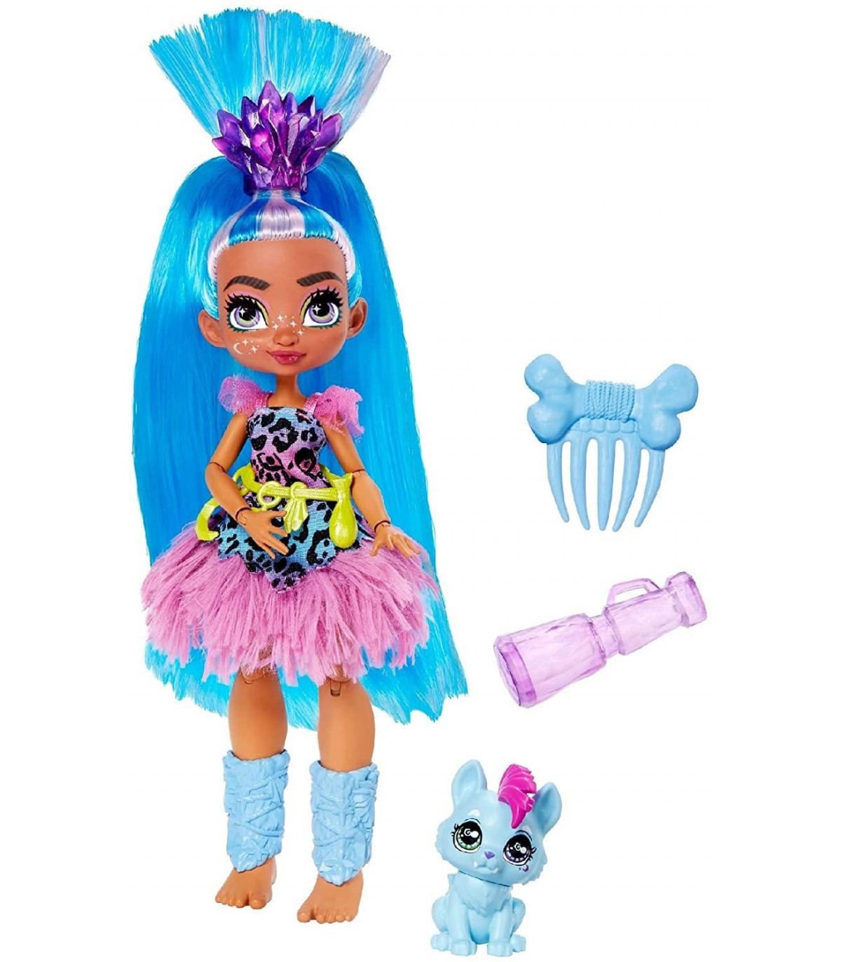 ¡Conoce a Cave Club™, un grupo de amigos prehistóricos muy revoltosos y adelantados a su época! Los muñecos Cave Club™ dan rienda suelta a unas alucinantes aventuras con sus divertidos peinados, sus looks de neón brillante y sus adorables y feroces dinosaurios como mascotas. Con la de ayuda de su místico telescopio, Tella™ puede vislumbrar el futuro y está lista para todo lo que le depare con su diadema de «cristal» y un vestido con estampado celestial y ribete de pelo. Cave Club muñeca Tella incluye su mascota de lobo, además de un peine prehistórico y su telescopio clarividente. Con codos, muñecas y rodillas articulados, ¡los niños podrán ayudarla a escapar de un dinosaurio T-Red, a esquivar un géiser de lava o a vislumbrar el futuro! Lleva tu imaginación a los albores de la civilización y descubre nuevas historias salvajes con los muñecos y juguetes de Cave Club™. Los niños a partir de 4 años pueden recrear aventuras con su amigo prehistórico favorito, ¡o bien pueden coleccionarlos todos para hacer historia con todo el grupo! Se venden por separado y están sujetos a disponibilidad. Los colores y la decoración pueden ser distintos de los mostrados.
