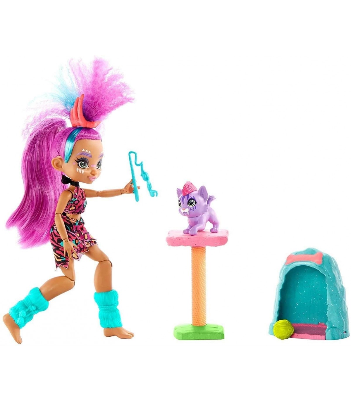 ¡Conoce a Cave Club™, un grupo de amigos prehistóricos muy revoltosos y adelantados a su época! Con las muñecas y conjuntos de juego de Cave Club™, los niños volverán al pasado y se embarcarán en aventuras épicas con sus personajes prehistóricos favoritos, como Roaralai™. Criada por tigres dientes de sable, Roaralai™ sabe desde que era una cachorrita que esos feroces felinos con dientes afilados rugen más fuerte de lo que muerden. Con este conjunto de juego, los niños ayudarán a Roaralai™ a mimar a su gatito dientes de sable, Ferrell™, con premios y juguetes. Una cueva para mascotas y una torre para gatos harán que Ferrell™ se sienta como en casa, y las piezas de juego más pequeñas (como un arenero, un recogedor, un cuenco y juguetes de gato) ayudan a que estos amigos estén preparados para todo, desde la hora de comer hasta la hora de jugar. ¡Transporta a los niños a los albores de la civilización y descubrirán nuevas historias salvajes con los muñecos y juguetes de Cave Club™! Los aventureros a partir de 4 años podrán coleccionar las muñecas y juguetes de Cave Club™ para crear historias con toda la pandilla. Se venden por separado y están sujetos a disponibilidad. Los colores y la decoración pueden ser distintos de los mostrados.