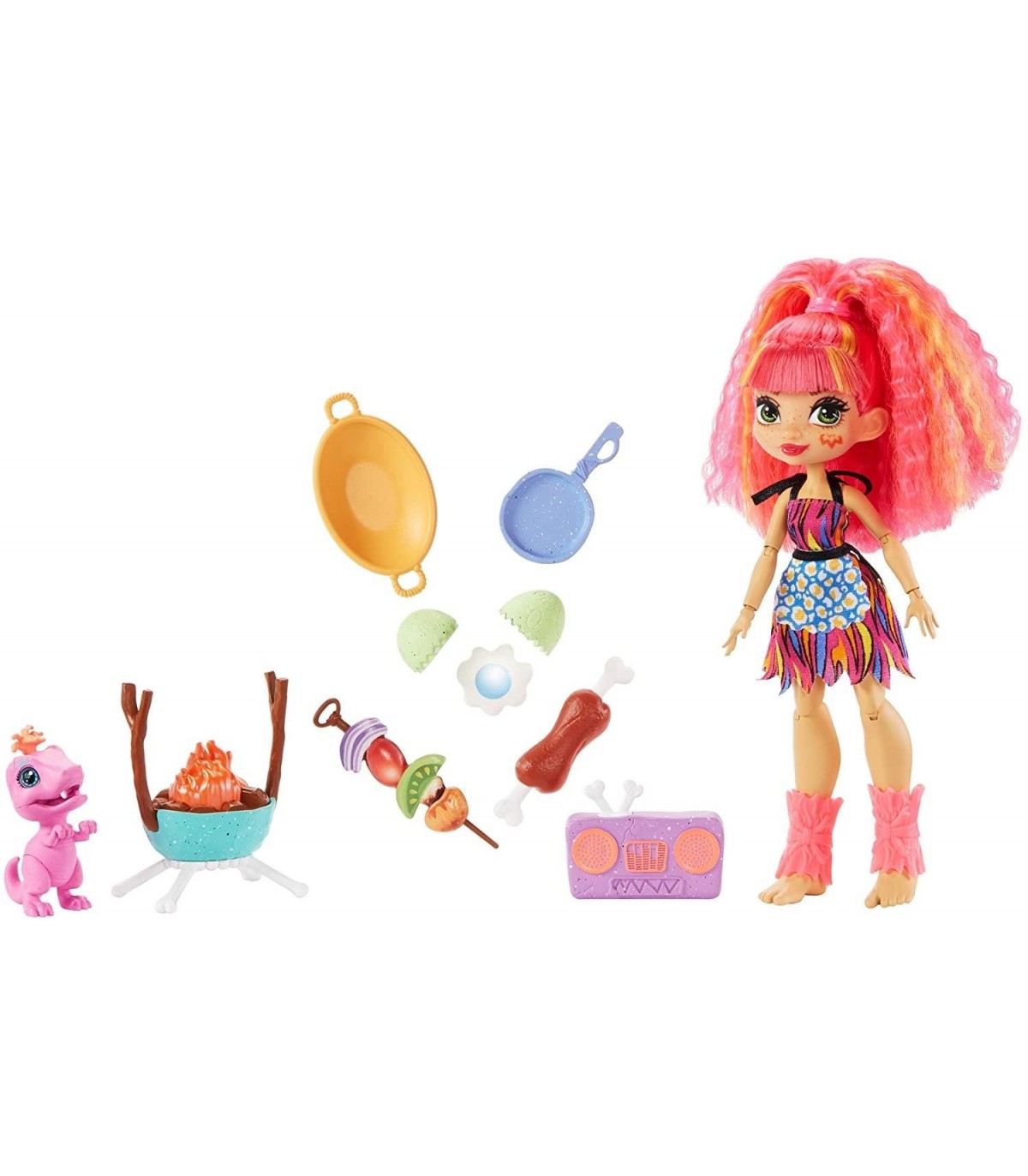 ¡Conoce a Cave Club, un grupo de amigos prehistóricos muy revoltosos y adelantados a su época. Con las muñecas y conjuntos de juego de Cave Club, los niños volverán al pasado y se embarcarán en aventuras épicas con sus personajes prehistóricos favoritos, como Emberly. Emberly descubrió el fuego, así que es normal que sea ella quien celebre la primera barbacoa de la historia. Con este conjunto de aventuras, los niños podrán ayudar a Emberly y a su dinosaurio mascota, Flaire, a cocinar todo tipo de historias. Una hoguera y un asador giratorio iniciarán las aventuras; coloca una pieza de comida sobre las llamas y gira para "asarla". Sube el volumen de la radio; gírala para para ver a los pájaros tocando el tambor. Después, ponte a cocinar con la bandeja para servir, la sartén y las piezas de comida, como un pinchito, una pieza de barbacoa y un huevo que los niños podrán "cascar" de verdad. ¡Transporta a los niños a los albores de la civilización y descubrirán nuevas historias salvajes con los juguetes de Cave Club. Los aventureros a partir de 4 años podrán coleccionar las muñecas y juguetes de Cave Club para crear historias con toda la pandilla. Se venden por separado y están sujetos a disponibilidad. Los colores y la decoración pueden ser distintos de los mostrados.