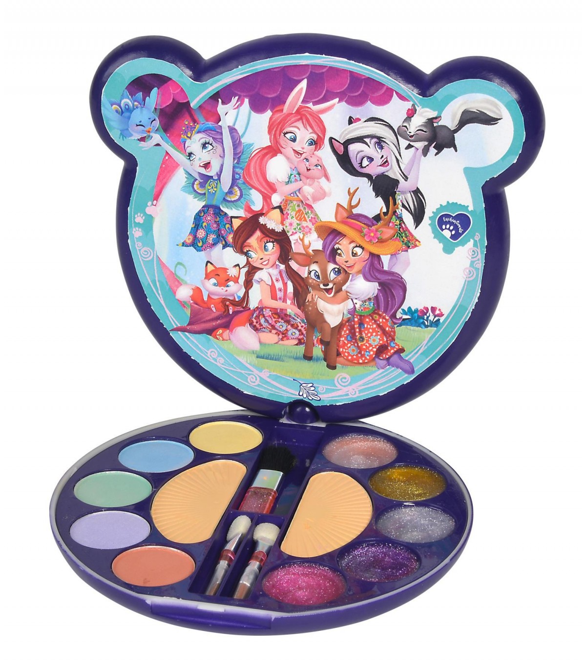 cajita de maquillaje decorada con los simpaticos personajes de enchantimals, incluye gran cantidad de pinturas y maquillajes