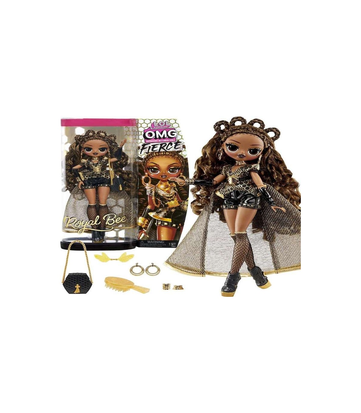 La caja viene con 15 sorpresas para descubrir que incluyen vestidos y accesorios llamativos y una muñeca de moda de 29 cm con un pelo realmente estiloso, Muestra su estilo Recibirás 1 muñeca de moda LOL Surprise OMG Fierce, ropa, gafas, pendientes, cinturón, cubrebotas, guante, estola de pelo, collares, bolso, zapatos, cepillo para el pelo y soporte para la muñeca Diviértete coleccionando las 4 muñecas de moda LOL Surprise OMG Fierce, Swag, Neonlicious, Lady Diva y Royal Bee, Sin miedo, Siempre de moda, Cautivadora La muñeca es articulada para poder posar, Cada momento es increíble con Royal Bee, Las muñecas de la serie 1 de LOL Surprise OMG están listas para desfilar, Son el regalo ideal para cualquier ocasión, para niños y niñas a partir de 3 años