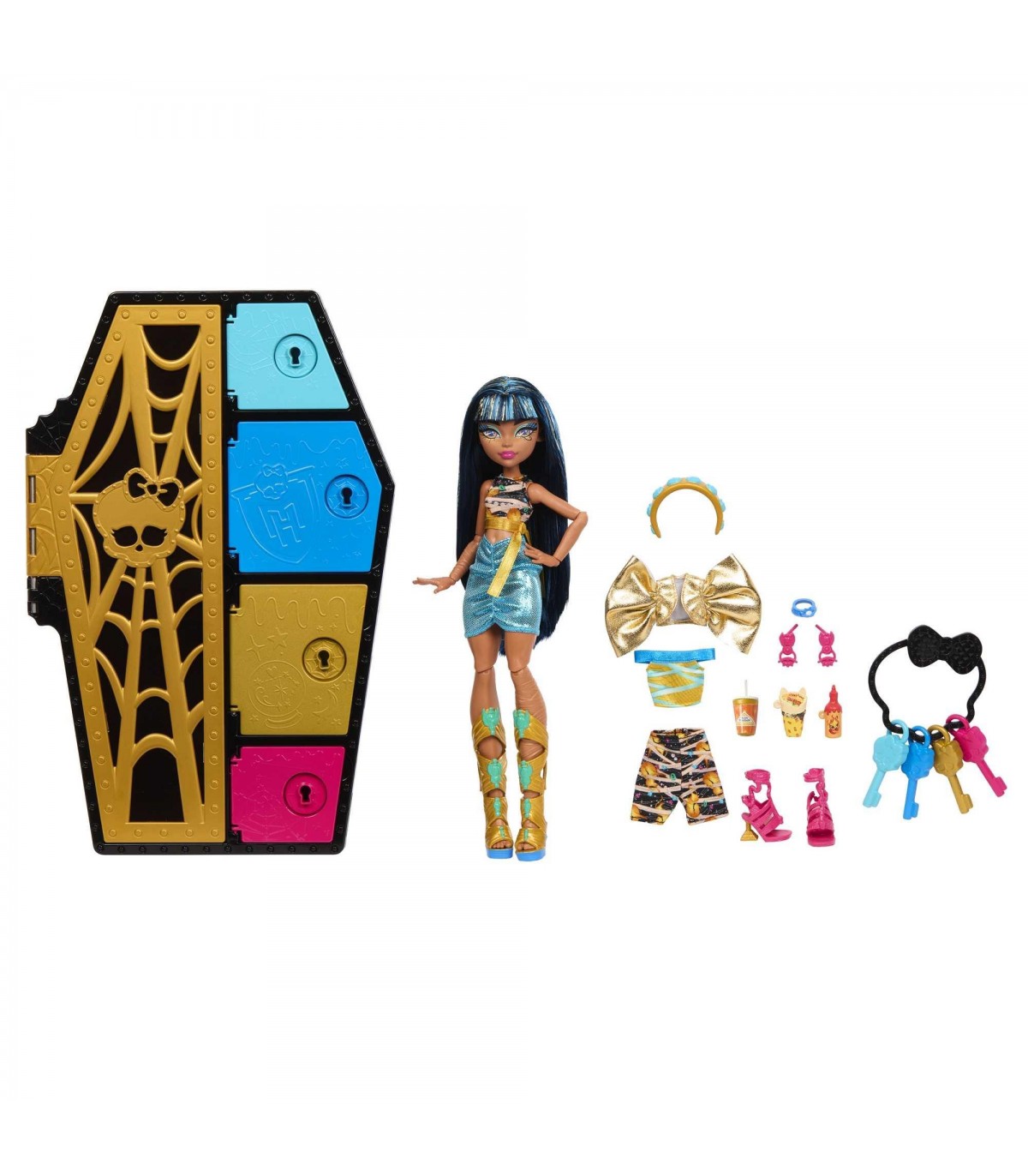 ¡La clase de Biolobogía de las monstruitas acaba de terminar en Monster High y por fin ha llegado la hora de cambiar de look! Esta muñeca Cleo de Nile de Skulltimate Secrets viene con una taquilla monstruosa y el último grito en moda. Eres capaz de guardar un oscuro secreto? Hazte con las cuatro llaves, haz desaparecer el escalofriante revestimiento de color negro y disfruta de un momento Color Reveal. Luego, abre los cuatro compartimentos con ellas y descubre qué misterios hay en su interior. Abrir la caja te helará la sangre y después la taquilla en forma de ataúd te servirá para imaginar un montón de historias y para guardar la muñeca Cleo De Nile con toda su ropa y accesorios.