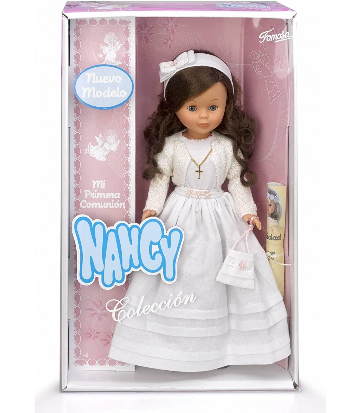 Preciosa muñeca Nancy vestida de Primera Comunión con un vestidito blanco, un bolsito a juego y una diadema muy elegante.