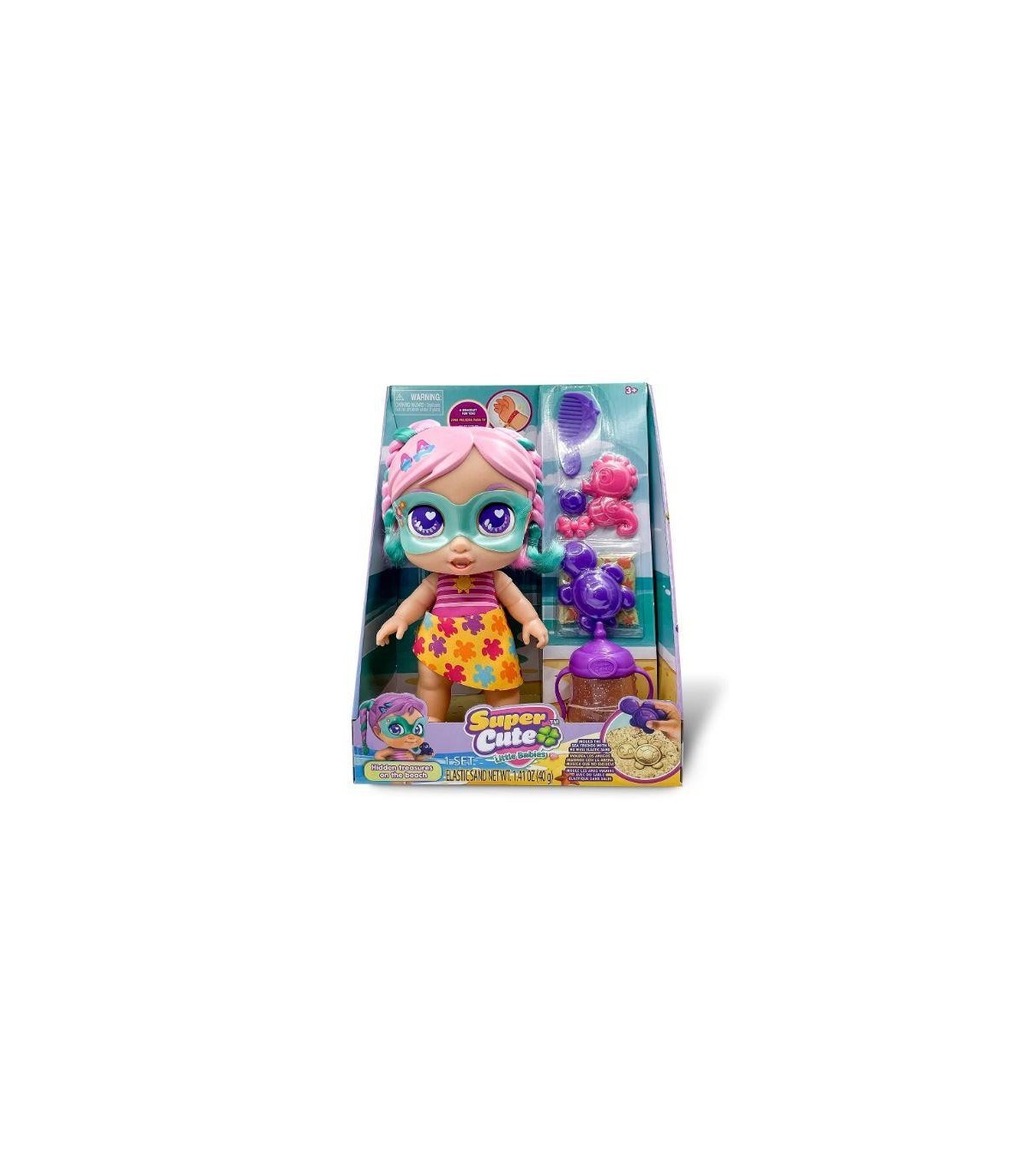 Os presentamos a Gabi, esta Super Cute viene con un pareo monísimo que puede convertirse en capa. Incluye: 1 muñeca, 1 mascara, 1 botella de leche, 1 cepillo, 1 peine, 1 molde de tortuga y otro de caballito de mar para la arena de la playa, 40 gr de arena estática, 1 pulsera de misión y 1 folleto de misión.