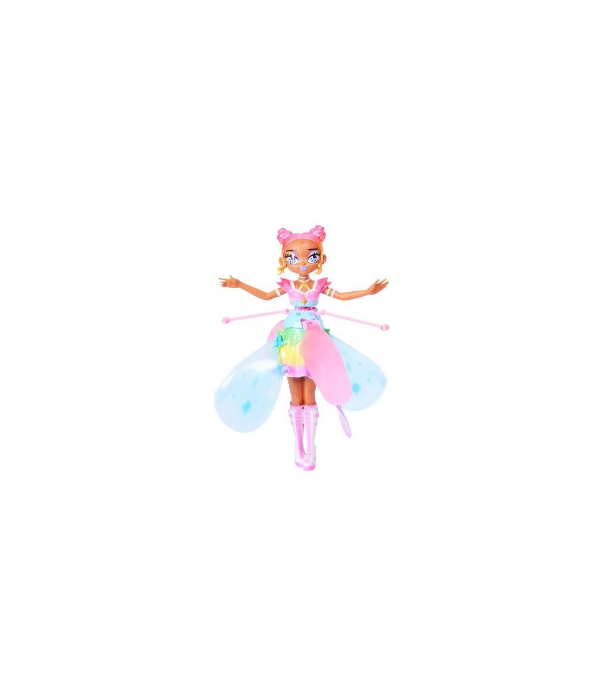 Las muñecas para niñas Crystal Flyers Rainbow Glitter Idol Pixie vuelan de verdad. Lánza el hada voladora desde la base o levántala en el aire y utiliza tus manos para guiarla. Cuando tu muñeca voladora Cristal Flyers Rainbow Glitter Idol está lista para volar, las luces LED de su vestido parpadean y sus alas empiezan a agitarse. A medida que vuela, ¡las alas centellearán y su vestido relucirá para iluminar el cielo