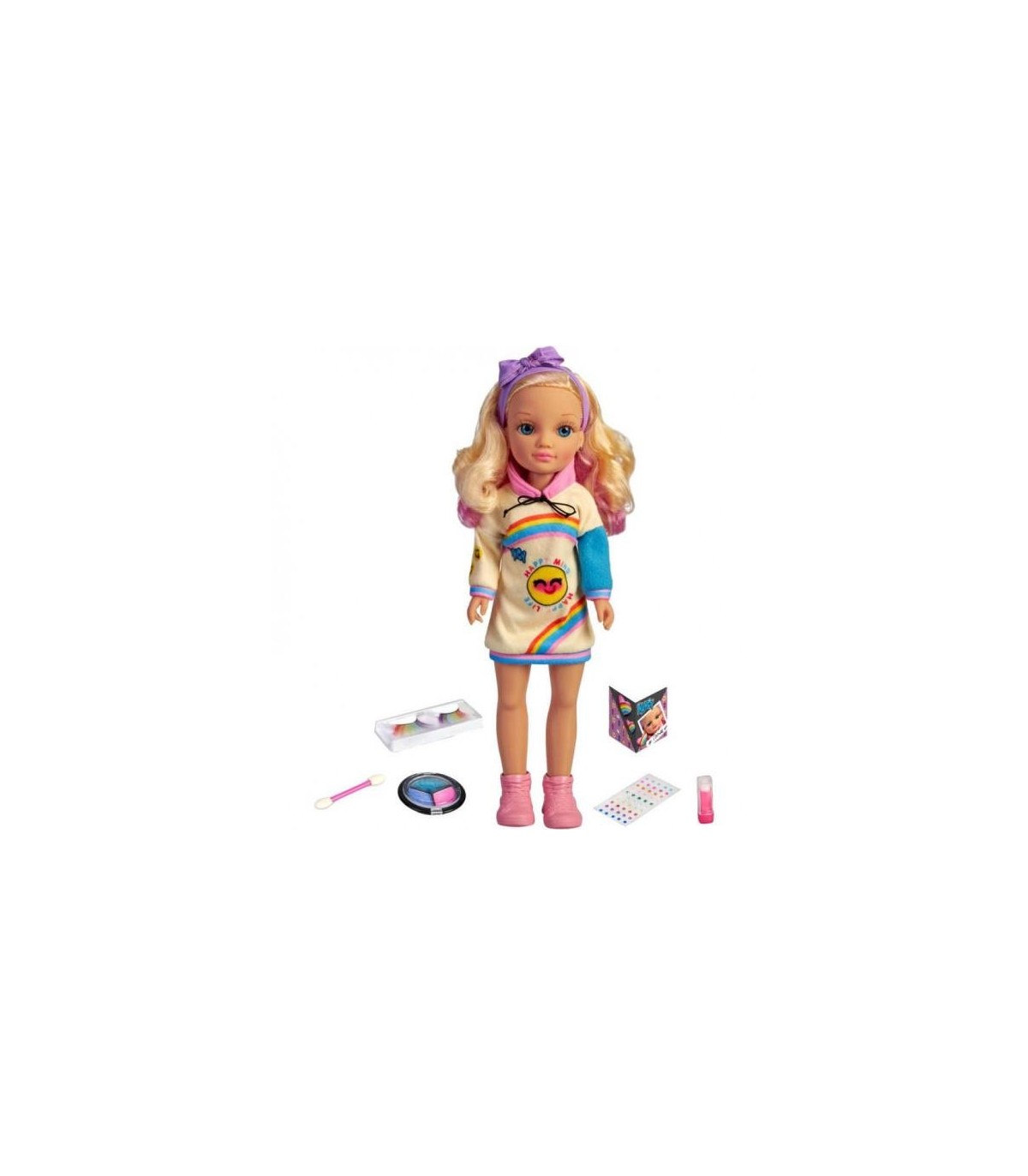 Nancy con maquillaje y accesorios para personalizar a tu gusto. Pestañas postizas multicolor Pintalabios y paleta de sobras de ojos con pincel Stickers de brillantes de colores Vestido oversize decorado con un arcoíris y unas zapatillas rosas Pelo rubio con mechas rosas recogido con una diadema.