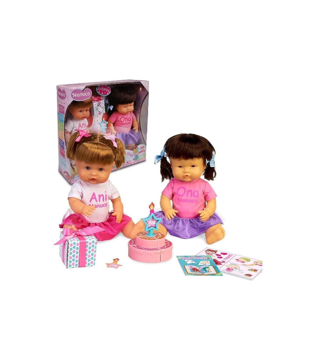 Incluye a Ani y Ona, dos muñecas Nenuco pequeñas de 35 centímetros de cuerpo duro y con pelo recogido en coletas castaño y moreno con lazos como complementos El set está ambientado en la temática de cumpleaños, contiene varios accesorios como una tarta que se separa en 4 partes y se puede volver a pegar gracias a su sistema de velcros También incluye una vela de juguete con forma de estrella con los nombres de las hermanitas traviesas Ani y Ona, que se pueden intercambiar Además, hay un regalo de cumpleaños para tus muñecas, en su interior hay un libro de manualidades para colorear y unas pegatinas para decorarlo