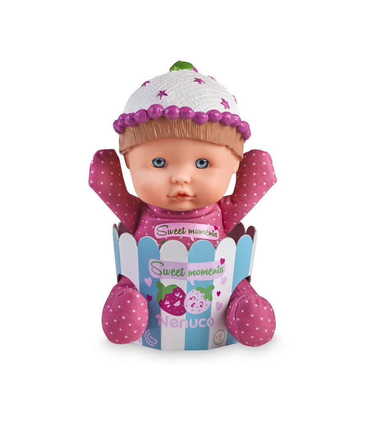 Muñeco magdalena Nenuco, con sombrero de tarta y cuerpo blandito, viene sentado en su envoltorio sacando los pies. Disponible en 4 colores, consíguelos todos.